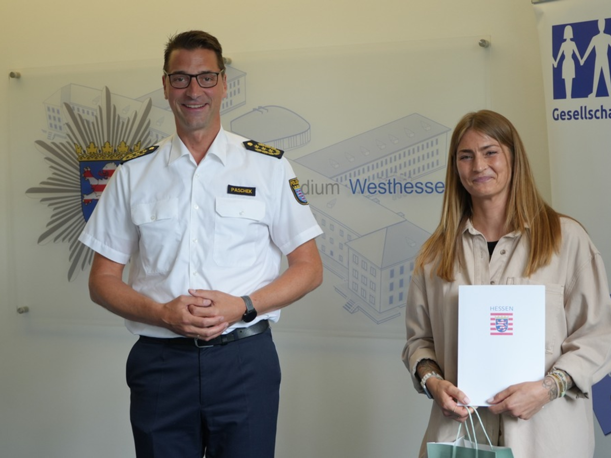Bei einem versuchten Tötungsdelikt konnten am Samstag, den 27.04.2024 zwei Zeugen den Angreifer ihrer Nachbarin überwältigen. Herr Paschek leitete den Fall ein, indem er betonte, wie groß der Mut der beiden gewesen sei. Die Zeugen wurden an diesem Tag auf laute Schreie aus dem Garten ihrer Nachbarin aufmerksam und sprangen über den angrenzenden Zaun. Sie konnten einen Mann sehen, welcher über die sitzende Dame gebeugt stand. Sofort riss der eine Zeuge den Mann von der Frau weg. Dabei verlor der Täter ein Messer und es wurde ersichtlich, dass er der Frau mehrfach in den Oberkörper gestochen und sie schwer verletzt hatte. Während der Zeuge den Täter festhielt, stieß der zweite Zeuge das Messer mit seinem Fuß außer Reichweite des Täters und leistete umgehend Erste-Hilfe. Die beiden Zeugen verblieben bei dem Täter sowie der Frau, bis die Polizei und der Rettungsdienst eintrafen. Die Frau wurde in ein Krankenhaus gebracht und dort notoperiert. Sie überlebte und befindet sich auf dem Weg der Besserung. Der Täter wurde festgenommen und sitzt seitdem in Haft. "Sie haben in einer absolut brenzligen Situation das Richtige getan und sich dabei selbst in höchste Gefahr gebracht. Hierfür spreche ich Ihnen in meinem und im Namen der Hessischen Polizei meine höchste Anerkennung aus."