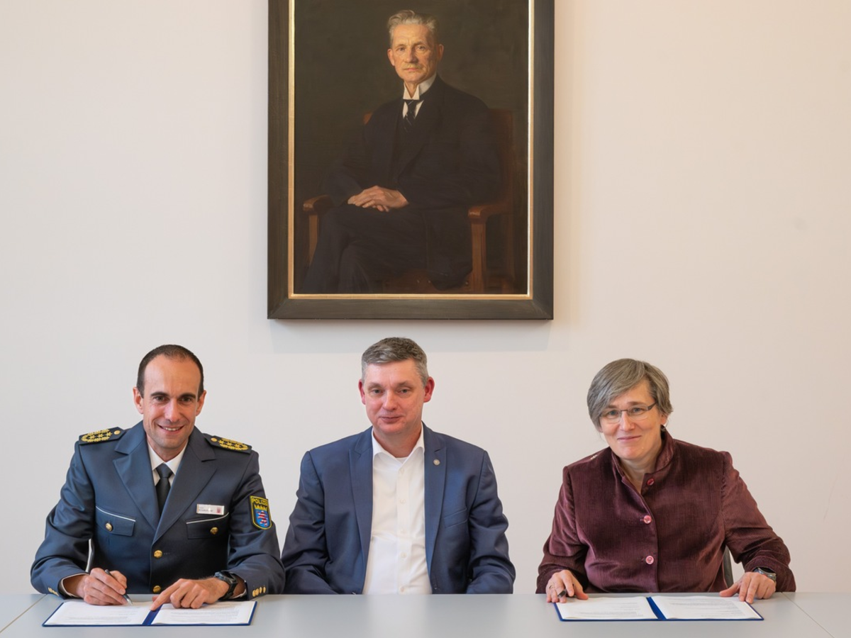 Die Förderung demokratischer Grundwerte und die StĂ€rkung historisch-politischer Bildung stehen im Mittelpunkt einer Kooperation der Arbeitsstelle Holocaustliteratur (AHL) der Justus-Liebig-UniversitĂ€t GieĂen (JLU) und des PolizeiprĂ€sidiums Mittelhessen (PPMH). Die PrĂ€sidentin der JLU, Prof. Dr. Katharina Lorenz, hat eine Vereinbarung fĂŒr eine "Allianz fĂŒr Demokratie" am Mittwoch gemeinsam mit Torsten KrĂŒckemeier, dem PrĂ€sidenten des PPMH, und im Beisein des AHL-Leiters Prof. Dr. Sascha Feuchert unterzeichnet. Die Kooperationsvereinbarung zielt darauf ab, durch gemeinsame Bildungs- und Erinnerungsarbeit einen aktiven Beitrag zur DemokratiestĂ€rkung zu leisten.