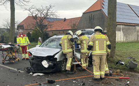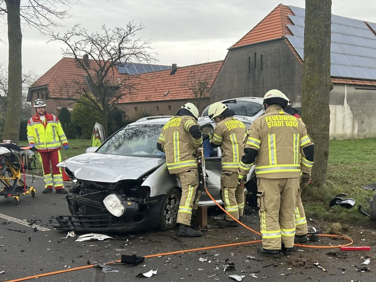 Goch - Bei einem Verkehrsunfall heute Mittag auf der Triftstraße in Nierswalde wurde ein Autofahrer aus Kleve in seinem VW Touran eingeschlossen. Sein Fahrzeug war frontal mit dem FIAT einer 78jährigen Frau kollidiert und anschließend gegen einen Baum geprallt. Einsatzkräfte der Freiwilligen Feuerwehr der Stadt Goch befreiten den 37jährigen Fahrer aus seinem Fahrzeug. Er erlitt durch den Unfall schwere Verletzungen. Erste Meldungen, wonach er im Touran eingeklemmt sein sollte, bestätigten sich zum Glück nicht. So konnte die Öffnung des Autos mit hydraulischen Rettungsgeräten schnell und unkompliziert durchgeführt werden. Die Fahrerin des FIAT war nicht eingeschlossen oder eingeklemmt. Sie erlitt ebenfalls schwere Verletzungen.