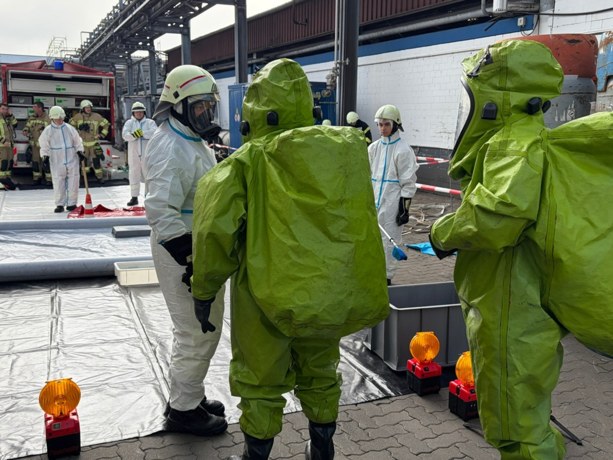 Eine der ersten Maßnahmen der Einsatzkräfte ist, den jeweils den austretenden Stoff und damit die Gefahrenlage zu bestimmen. Entsprechende Kennzeichnungen auf den Behältnissen waren hier jeweils hilfreich, so konnten Ammoniak und Butylamin als austretende Stoffe identifiziert werden. Entsprechend der Eigenschaften der Gefahrstoffe liefen die Maßnahmen der Feuerwehr an: Trupps in Chemikalienschutzanzügen dichteten die Leckagen ab und fingen austretende Stoffe so weit wie möglich auf. Im Anschluss wurden alle eingesetzten Kräfte vor Ort dekontaminiert. Auch diese Maßnahme, und damit der Eigenschutz der Feuerwehr-Kräfte, ist ein wichtiger Bestandteil einer jeden Übung und eines jeden Einsatzes, bei dem Gefahrstoffe im Spiel sind.