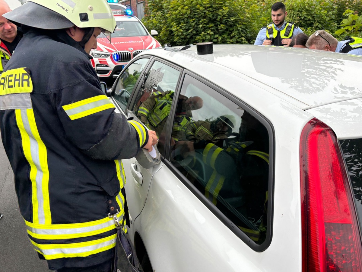 Goch - Zu einem Hilfeleistungseinsatz an der Hartogstraße in der Gocher Innenstadt wurde heute früh die Feuerwache II der Löschzüge Stadtmitte alarmiert: In einem PKW befand sich die 1,5jährige Amelie und hatte den Autoschlüssel in der Hand, den ihre Eltern draußen vermissten. Das Fahrzeug war verschlossen, die Eltern alarmierten die Feuerwehr. Eine Möglichkeit, den Volvo gewaltfrei zu öffnen gab es nicht, daher mussten sich die Einsatzkräfte einen Zugang durch eine Seitenscheibe verschaffen. Die Vorgehensweise in einem solchen Fall ist Folgende: Zunächst wird die Fahrzeugscheibe mit Klebeband abgeklebt, damit möglichst keine Glassplitter unkontrolliert umherfliegen. Dann wird die Scheibe mit einem sogenannten Federkörner zerborsten. Die gebrochene Scheibe kann dann zusammen mit den Klebestreifen problemlos entfernt werden. Dann galt es nur noch, in den Volvo zu klettern um die Zentralverriegelung von innen zu öffnen und Amelie konnte wohlbehalten in die Arme ihrer Eltern übergeben werden.