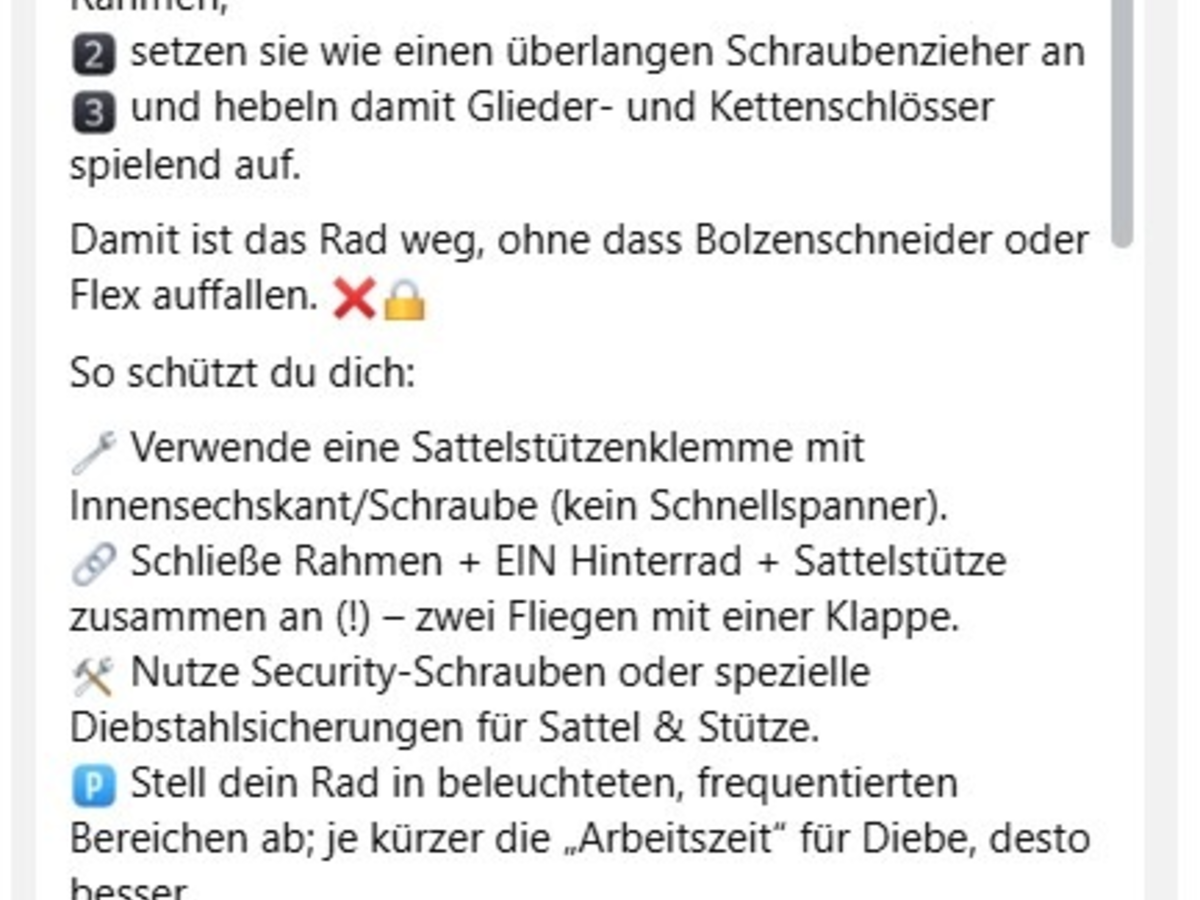 Am meisten angeklickt wurde das Video "Achtung, neue Masche bei Fahrraddiebstahl", das sich auf den Einsatz der SattelstĂŒtze beim Knacken von Schlössern bezieht (siehe Screenshot).