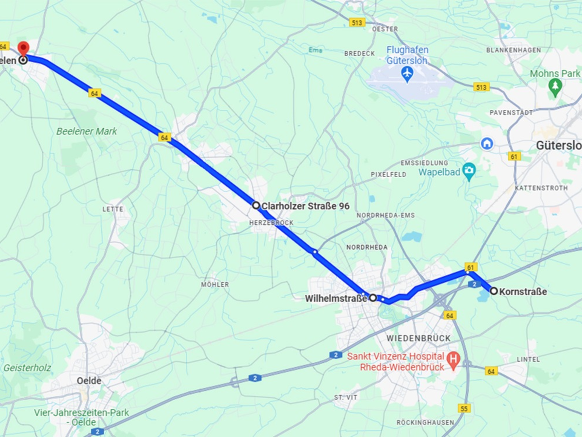 Kornstraße/ Wiedenbrück, Gütersloher Straße/ Rheda, Wilhelmstraße/ Rheda, Herzebrocker Straße/ Rheda, B 64 in Richtung Beelen.