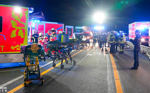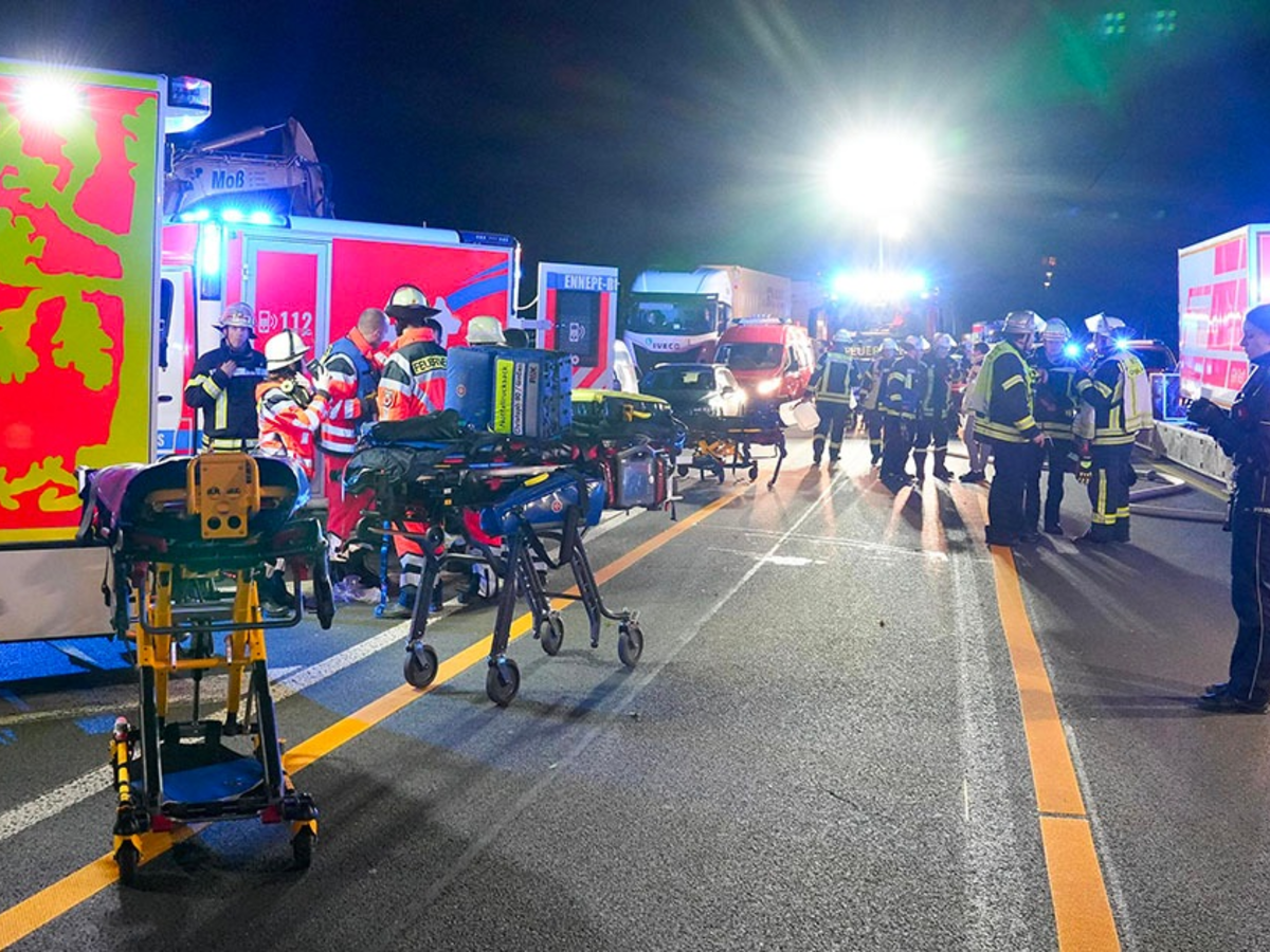 Hagen - Gegen 17:37 gingen bei der Leitstelle der Feuerwehr Hagen zahlreiche Notrufe ein. Gemeldet wurde ein Unfall auf der BAB 1 mit Beteiligung eines Lkw und mehrerer Pkw. Daraufhin wurden zahlreiche KrĂ€fte der Feuerwehr Hagen und des Rettungsdienstes alarmiert. Aufgrund der unklaren Lage wurde ein Massenanfall von Verletzen (ManV) angenommen und so weitere KrĂ€fte in den Einsatz geschickt. Im Laufe des Einsatzes stellte sich heraus, dass die Einsatzstelle sich weit ĂŒber den Hagener Einsatzabschnitt hinaus erstreckte. Insgesamt waren im Einsatzbereich der Feuerwehr Hagen mehr als 120 EinsatzkrĂ€fte der Berufs- und Freiwilligen Feuerwehr, des Rettungsdienstes und mehrerer Hilfsorganisationen im Einsatz. Mehrere Patienten wurden durch die EinsatzkrĂ€fte versorgt und die Einsatzstelle durch die Feuerwehr abgesichert und ausgeleuchtet.
