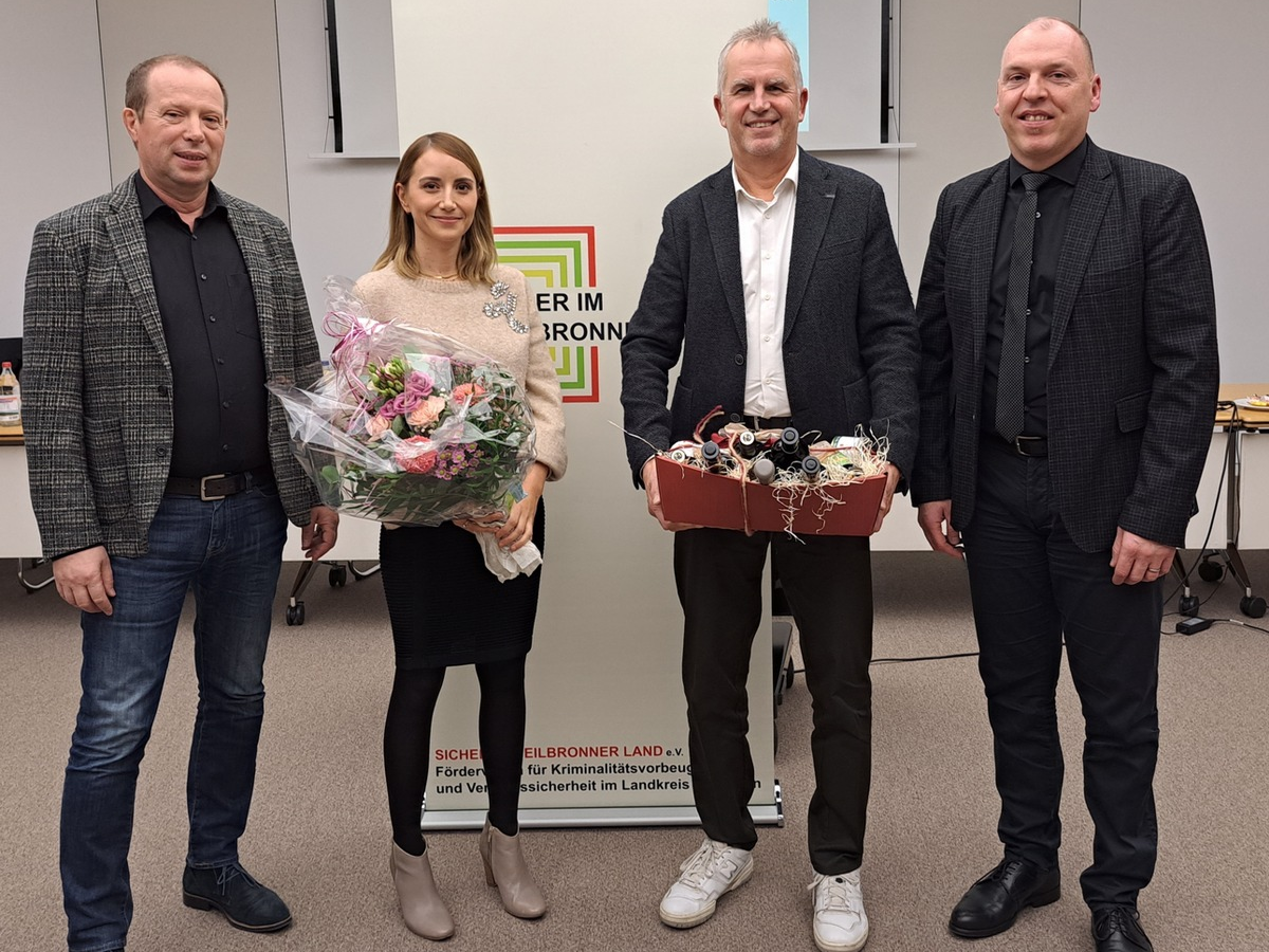 In der Mitgliederversammlung des präventiven Fördervereins "Sicher im Heilbronner Land e.V." wurden zwei Vorstandsfunktionen neu besetzt. Der im Frühjahr 2023 in den Ruhestand getretene ehemalige Polizeipräsident von Heilbronn, Hans Becker, wurde aus der Vorstandschaft verabschiedet. Hans Becker hatte fünf Jahre lang die Funktion des zweiten Vorsitzenden inne. In seiner Amtszeit trieb er die vielfältigen präventiven Projekte des Vereins mit viel Herzblut voran. Als seinen Nachfolger wählten die Vereinsmitglieder den amtierenden Polizeipräsidenten des Polizeipräsidiums Heilbronn, Frank Spitzmüller, einstimmig zum zweiten Vorsitzenden. Frank Spitzmüller bedankte sich bei Hans Becker für sein großes Engagement in der Präventionsarbeit. Er hob die Wichtigkeit von kriminalpräventiven und verkehrsunfallpräventiven Maßnahmen hervor und sicherte den Mitgliedern seine volle Unterstützung zu. Bei der Funktion des Schriftführenden gab es ebenfalls einen Wechsel. Brigitte Seiz schied aus familiären Gründen aus der Vorstandschaft aus. Das Amt übernahm Walter Schuster vom Landratsamt Heilbronn. Herr Schuster wurde ebenfalls einstimmig zum Schriftführer gewählt. Sicher im Heilbronner Land e.V. hat unter Leitung des ersten Vorsitzenden, Landrat Norbert Heuser, im Jahr 2022 Fördermittel von mehr als 19.000 Euro für Präventionsprojekte im Landkreis Heilbronn bereitgestellt. Darunter gab es verschiedene Projekte zur Förderung der Zivilcourage, wie beispielsweise die Verleihung des Zivilcouragepreises. Ebenso wurden mehrere Projekte aus dem Bereich der Gewalt- oder Suchtprävention gefördert. Auch verkehrspräventive Projekte für junge Kraftfahrzeugführende oder Biker wurden unterstützt. Vereinshistorie: Landrat Detlef Piepenburg gründete Sicher im Heilbronner Land e.V. im Jahr 2006. Seitdem förderte der Verein Präventionsprojekte mit mehr als 400.000 Euro. Neben den Kommunen im Landkreis Heilbronn sind auch verschiedene Institutionen, Vereine und Privatpersonen Mitglied im Förderverein. Wenn Sie die Arbeit von Sicher im Heilbronner Land e.V. mit Ihrer Mitgliedschaft unterstützen oder sich näher informieren möchten, finden Sie uns auf der Homepage www.sicherimheilbronnerland.de. Die Geschäftsstelle erreichen Sie unter Telefon 07131/104-2727 oder Email info@sicherimheilbronnerland.de.