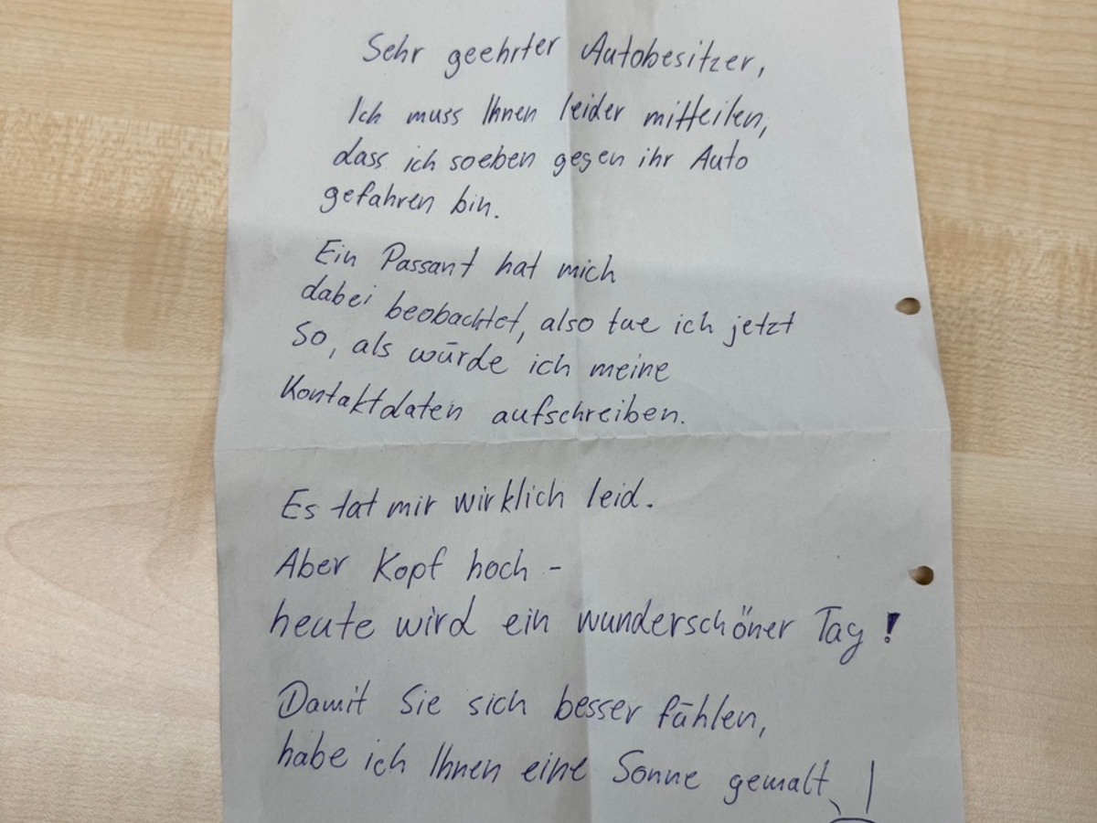 Herdecke - Am 10.02.2025 wurde bei einer Verkehrsunfallflucht ein schwarzer Volkswagen beschädigt. Ungefähr zwischen 6:00 und 9:15 Uhr ist mutmaßlich ein PKW in das besagte Auto gefahren, welches sich zu diesem Zeitpunkt an der Hauptstraße in Herdecke befand. Als der Fahrzeugführer gegen 9:15 Uhr zu seinem Auto gegangen ist, stellte er fest, dass sich ein Zettel an seiner Windschutzscheibe befand, auf dem stand, dass das Fahrzeug beschädigt wurde. Allerdings wurden keine schadensregulierenden Maßnahmen eingeleitet (siehe Foto). Da die Polizei aufgrund des Hinweises davon ausgehen muss, dass die Verkehrsunfallflucht beobachtet wurde, sucht sie nach Zeuginnen und Zeugen. Wer zum oben genannten Zeitpunkt etwas gesehen hat und Hinweise zum Unfallverursacher oder zum Unfallhergang geben kann, meldet sich bitte bei der Polizei unter der 02335 9166-2300.
