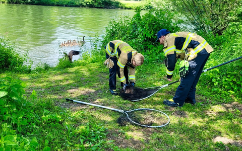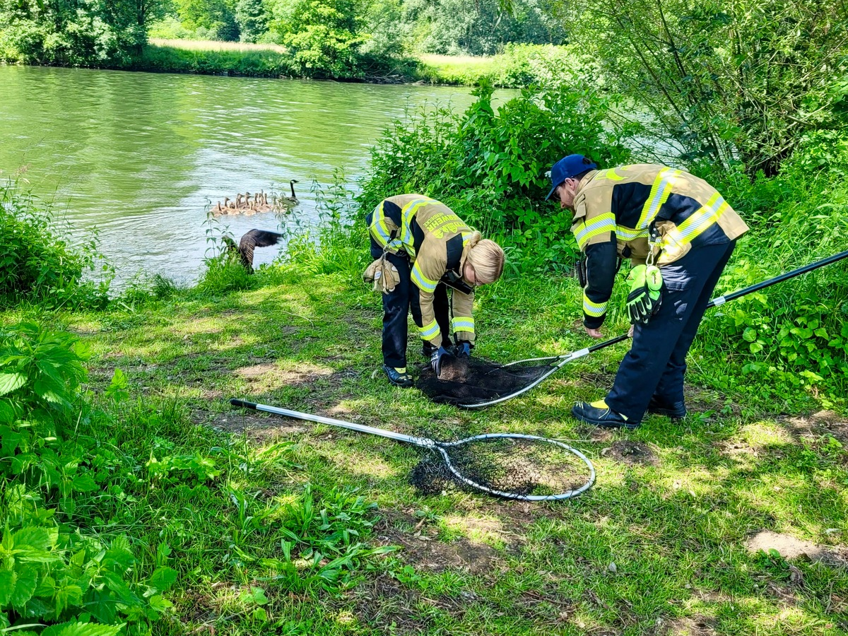 Eine Junggans wurde mit einem Angelhaken im Mund vorgefunden. Die Feuerwehr fing das Tier an Land behutsam ein und befreite es vom Haken. Anschließend wurde das Jungtier wieder zu seiner Familie entlassen. Leider wurde der Einsatz durch mehrere rücksichtslose Radfahrer gestört. Wenn Einsatzkräfte mit einem Einsatzfahrzeug und auf dem Radweg sichtbar tätig sind, hat man auch dort die Geschwindigkeit zu drosseln oder gar zu schieben. An sonsten können Einsatzkräfte gefährdet werden".