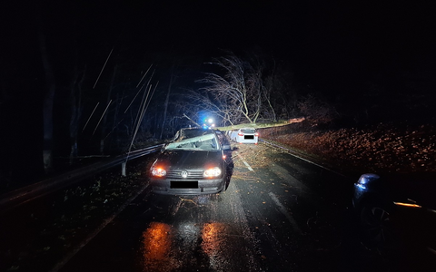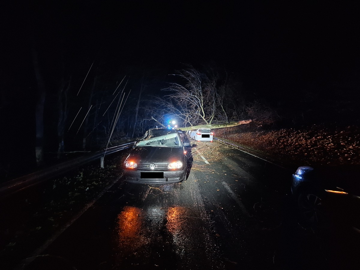 Nach bisherigen Erkenntnissen, befuhren ein Pkw VW Golf und ein Ford C-Max die Kreisstraße, als die Fahrzeugführer den umstürzenden Baum bemerkten. Trotz des Versuchs diesem auszuweichen, wurden beide Autos von dem umstürzenden Stamm getroffen. Dieser schlug bei den Fahrzeugen im Bereich des Dachs und der Windschutzscheibe ein. Die 24 Jahre alte Fahrerin des Ford und der 38-jährige VW-Fahrer blieben bis auf einen Schock unverletzt. Auch ein 9 Jahre altes Kind, das sich als Beifahrer in dem VW Golf befand, erlitt einen Schock.