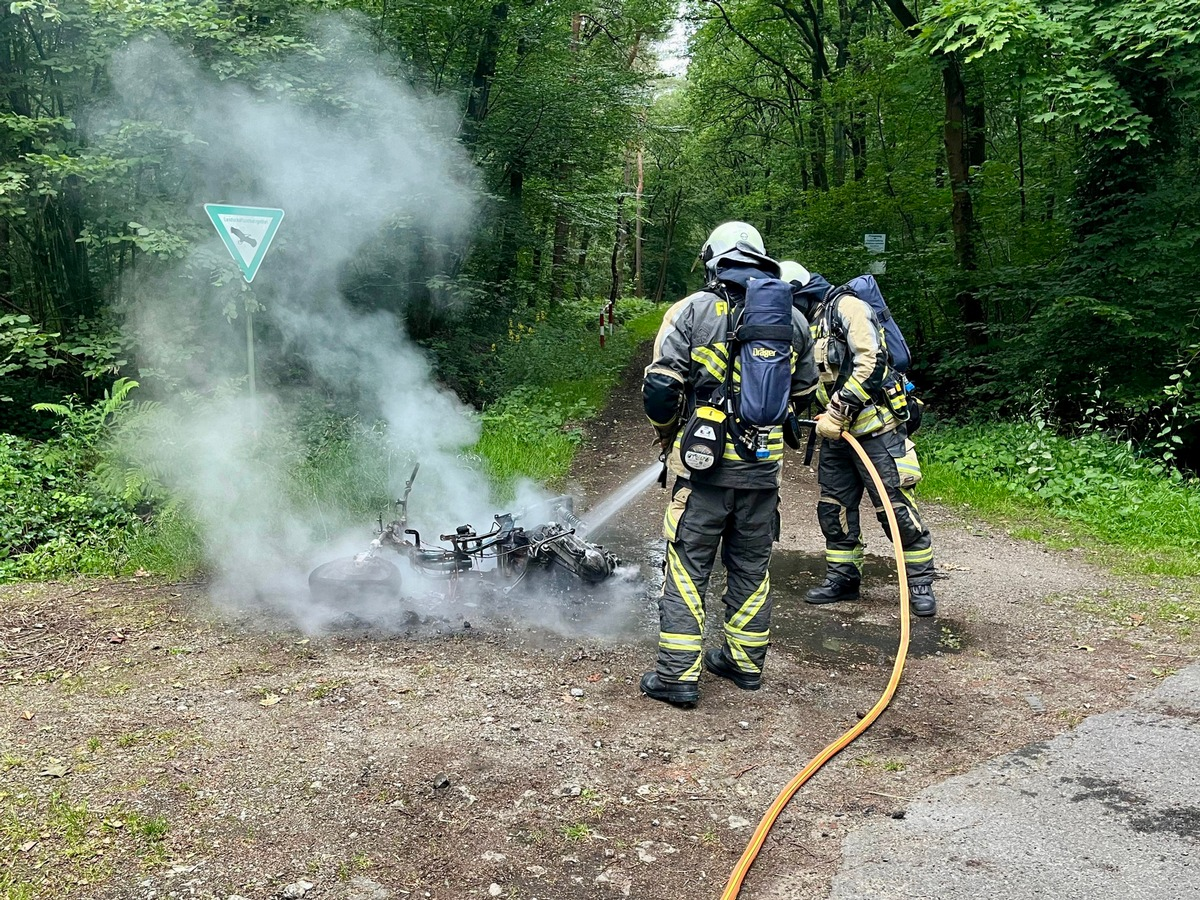 An der Grenze zum Stadtgebiet Dinslaken brannte ein Motorroller in voller Ausdehnung. Die Einsatzstelle wurde gegen den fließenden Verkehr abgesichert und die Brandbekämpfung eingeleitet. Ein Trupp unter Atemschutz löschte das Feuer. Abschließend wurde das Fahrzeug sowie die nähere Umgebung mit der Wärmebildkamera kontrolliert, es konnten keine Auffälligkeiten festgestellt werden. Der Einsatz war nach ca. 45 Minuten beendet.