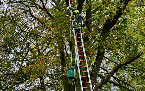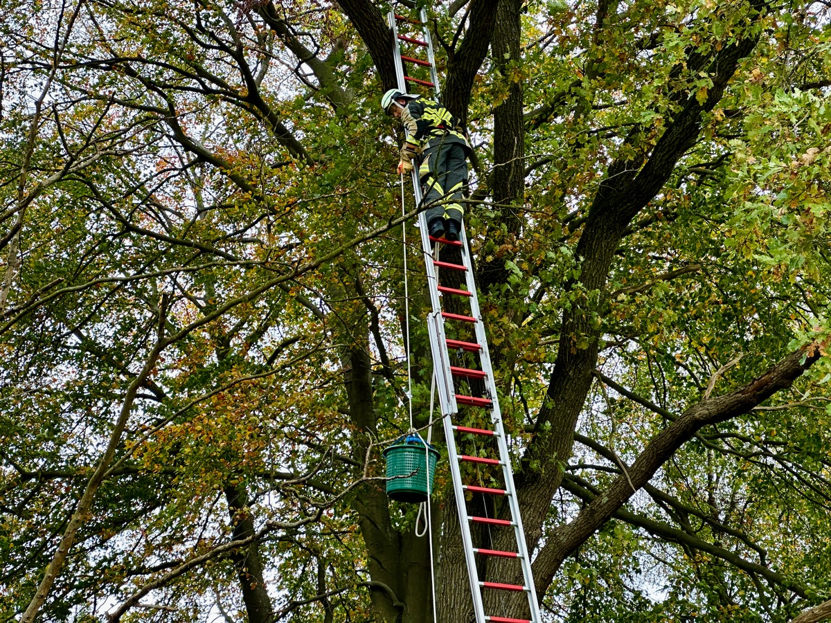 Eine Katze war auf einen Baum geklettert und saß dort nach Angaben der Besitzer schon einige Zeit. Da sie nicht den Eindruck machte, aus eigener Kraft wieder herunterkommen zu können, wählten sie den Notruf. Mit der dreiteiligen Schiebleiter näherten sich die Einsatzkräfte dem Tier in etwa 11 Metern Höhe. Nachdem sich die Katze ohne Gegenwehr greifen ließ, konnte sie mit einem Korb, der an einer Feuerwehrleine hochgezogen wurde, sicher zu Boden gebracht werden. Dort flüchtete sie unvermittelt in das angrenzende Waldstück. Nach 45 Minuten war der Einsatz für die Kameraden beendet.
