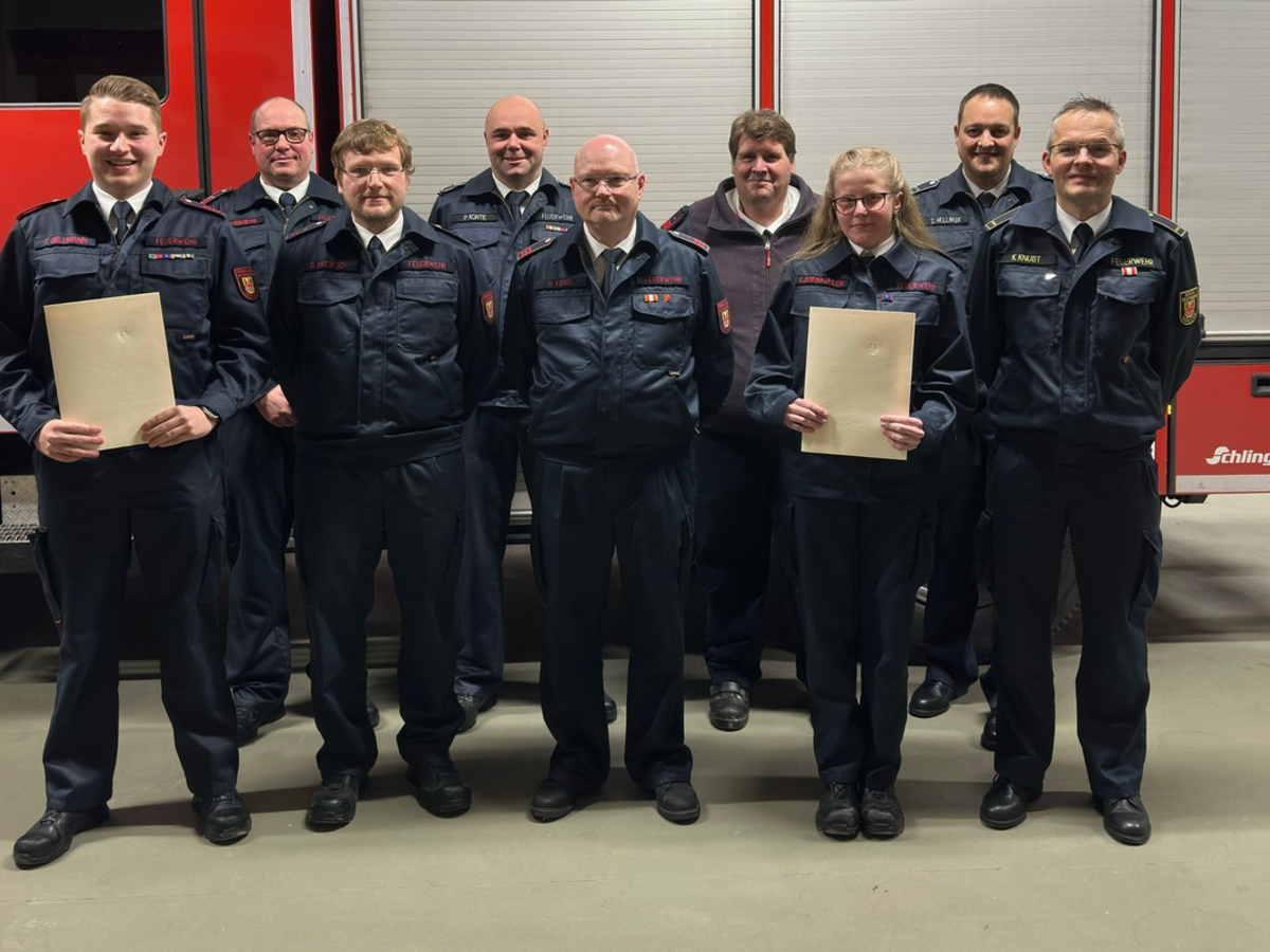 Iserlohn - Am Samstag, den 18.01.2025 fand die diesjährige Jahresdienstbesprechung der Löschgruppe Hennen statt. Gemeinsam mit dem stellv. Leiter der Feuerwehr Iserlohn Klaus Knust, dem Verbandsführer Sven Hellnigk und dem Sprecher der Freiwilligen Feuerwehr Peter Korte konnte die Löschgruppe auf ein ereignisreiches Jahr 2024 zurückblicken. Neben 20 Einsätzen wurden zahlreiche Dienste und Einsatzübungen absolviert. Besonders konnte auf das 125-jährige Bestehen der Einheit zurückgeblickt werden, welches mit einem Fest und der Bevölkerung ausgiebig gefeiert wurde. Auch in diesem Jahr konnten einige Kameradinnen und Kameraden an Lehrgängen teilnehmen, um ihr Wissen zu erweitern und zu vertiefen. Zur Abrundung des Abends konnten zwei Beförderungen und eine Ehrung vorgenommen werden. So wurde Lena Steinkühler zur Oberfeuerwehrfrau und Tim Sellmann zum Unterbrandmeister befördert. Holger König erhielt eine Ehrung für 40 Jahre Dienst in der Freiwilligen Feuerwehr, die ihm von Christian Eichhorn, stellvertretender Vorsitzender des VdF NRW, überreicht wurde. Wir gratulieren den beiden Kameraden und unserer Kameradin und wünschen ihnen alles Gute.