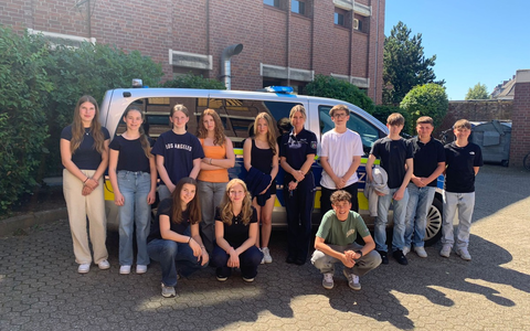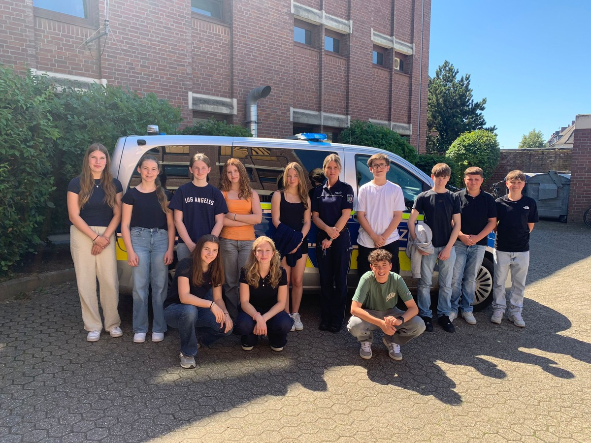 Polizeihauptkommissarin Melanie Arenz stellte den Jugendlichen den Wach- und Wechseldienst vor und führte sie durch die Polizeiwache Jülich. Ein Highlight war der Blick in den Streifenwagen, bei dem Schülerinnen und Schüler das Gewicht einer Überzieh-Schutzweste testen konnten, was für staunende Augen sorgte.