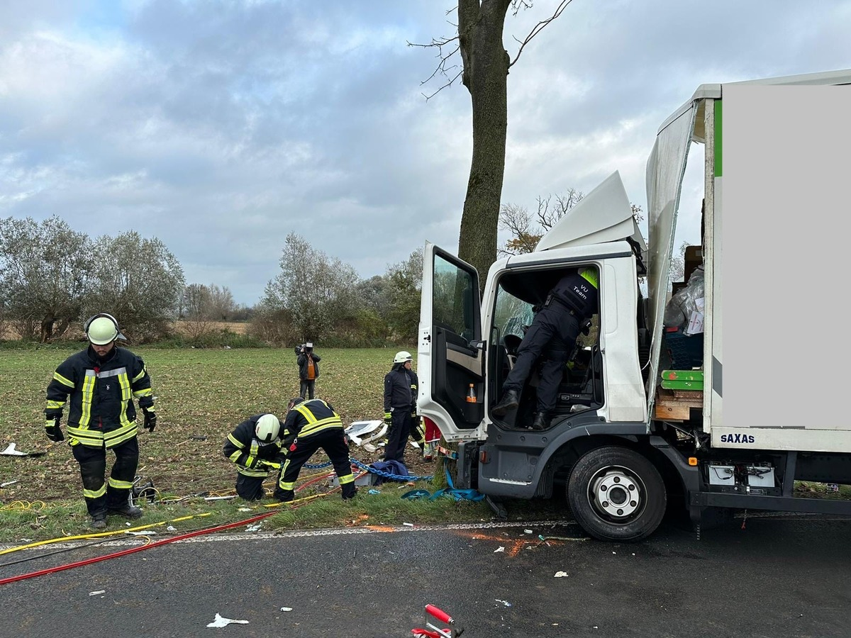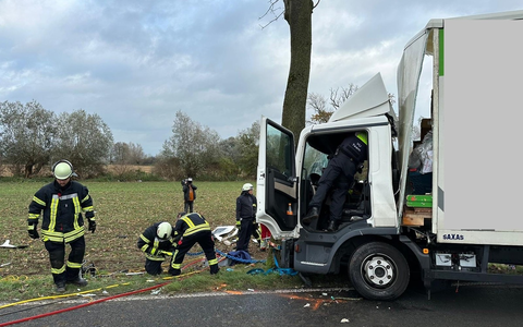 Kalkar - Am 23.11.2023 um 11:55 Uhr wurden die Löschgruppen Appeldorn und Niedermörmter sowie den Rüstsatz des Löschzuges Mitte der Freiwilligen Feuerwehr Stadt Kalkar zu einem Verkehrsunfall auf der Appeldorner Straße alarmiert. Ein LKW kam von der Fahrbahn ab und pralle gegen einen Baum. Der Fahrer wurde dabei in dem Fahrerhaus eingeschlossen und wurde patientenorientiert gerettet. Der Beifahrer wurde schwer eingeklemmt. Der LKW musste durch ein Feuerwehrfahrzeug erst vom Baum weggezogen werden bevor dieser ebenfalls patientenorientiert gerettet werden konnte. Beide verunfallten Personen wurden mittels Rettungshubschrauber in ein Krankenhaus geflogen. Besonders erwähnen möchte Roland Matenaer, Leiter der Feuerwehr Kalkar und Einsatzleiter vor Ort, die professionelle Zusammenarbeit zwischen allen Beteiligten des Rettungsdienstes, der Polizei und Feuerwehr. "Wir wussten immer über den aktuellen Zustand der Verletzten bescheid und konnten so die Rettung genau planen und anpassen. Alle waren wie immer sehr professionell und der Ablauf reibungslos. Es wirkte allerdings als ob man genau diese Situation vorher gemeinsam geübt habe" so Matenaer. Neben der Rettung wurden auslaufende Betriebsstoffe aufgenommen und der Brandschutz sichergestellt. Die Straße war während der gesamten Zeit gesperrt. Etwa 20 Feuerwehrleute waren über drei Stunden im Einsatz. Die Einsatzstelle wurde zur Unfallaufnahme an die Polizei übergeben.