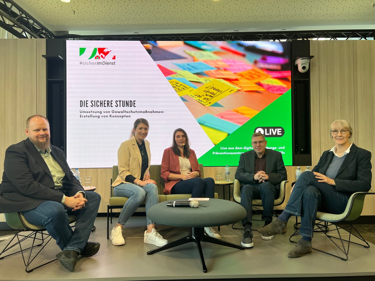 Moderiert wurde die Veranstaltung von Sandra Simon von der Sicherheitskooperation Ruhr. Als Gesprächsgäste teilten Anika Braun vom Betrieblichen Gesundheitsmanagement der Landeshauptstadt Düsseldorf, Maximilian Faßbender, Teamleiter Sicherheit der Universität Siegen, Dirk Kursim, Beauftragter für Arbeits- und Gesundheitsschutz beim Jobcenter Arbeitsplus Bielefeld, sowie Eva Aich, Sachgebietsleiterin Arbeitsschutz bei der Bezirksregierung Düsseldorf, ihre Erfahrungen.