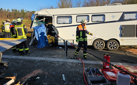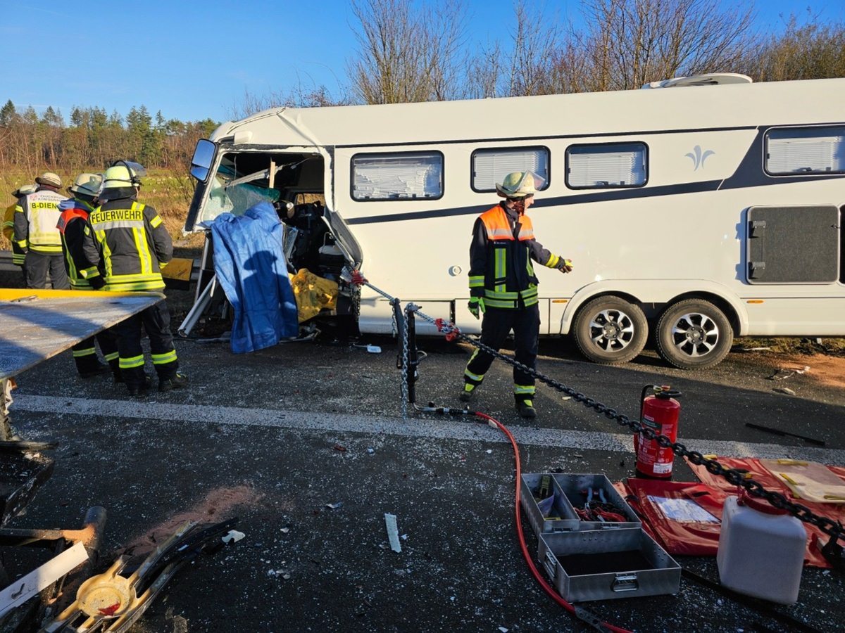 Erneut wurde den Mitgliedern der Freiwilligen Feuerwehr Königswinter "TH3-PKLEMMT" auf den Meldeempfängern angezeigt. In Fahrtrichtung Köln waren um kurz vor 12 Uhr ein Kleinwagen, ein Abschleppfahrzeug und ein Wohnmobil auf einen stehenden Sattelzug aufgefahren. Bei Eintreffen der Einsatzkräfte lagen Trümmerteile weit verstreut auf der Fahrbahn. Durch eine zufällig vorbeifahrende Polizeibeamtin war die Unfallstelle bereits abgesichert. Die Kollegin konnte eine qualifizierte Lageeinweisung geben. In einem Wohnmobil war der Fahrer zwischen den beiden Sitzen eingeklemmt. Das Fahrzeug war äußerlich und im Innenraum stark zerstört. Teile der Küchenelemente waren durch die Fahrgastzelle geflogen. Seine Ehefrau betreute den eingeklemmten Mann im Fahrzeug. Durch ein notärztlich ausgebildet Mitglied konnte die Feuerwehr noch vor Eintreffen des Rettungsdienstes eine erste Versorgung bieten. Da das moderne Wohnmobil aus Alupanelen in Leichtbauweise gefertigt war, konnten herkömmliche Techniken zur Befreiung kaum angewandt werden. Mit einer Säbelsäge öffnete die Feuerwehr die Karosserie, um an den Patienten zu gelangen. Die ebenfalls schwer verletzte Frau konnte zuerst gerettet werden. Sie war nicht eingeklemmt. Mit einem hydraulischen Rettungsgerät und dem Einsatz von Ketten, konnte ein Sitz gezogen und die Einklemmung behoben werden. Von zwei Seiten wurde dabei gearbeitet. Um einen schnelleren Transport zu gewährleisten, wurden zwei Rettungshubschrauber an die Einsatzstelle gerufen. Diese brachten die schwer Verletzten in ein Unfallklinikum. Für den Fahrer besteht Lebensgefahr. Drei weitere beteiligte Personen wurden vom Rettungsdienst untersucht und versorgt. Auslaufende Betriebsstoffe wurden aufgefangen und mit Bindemittel abgestreut. Während der Rettungsmaßnahmen blieb die Autobahn in Fahrtrichtung Köln voll gesperrt. Die Polizei leitete den Verkehr an der Anschlussstelle Siebengebirge ab. Nach knapp drei Stunden konnte die Feuerwehr die Einsatzstelle verlassen Zur Unfallaufnahme wurde ein Unfallaufnahmeteam hinzugezogen. Die Autobahn ist während der Bergungsmaßnahmen weiterhin gesperrt.