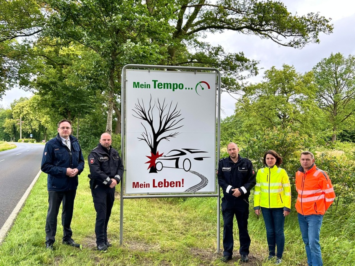 Landkreis Verden - Großschilder "Mein Tempo... Mein Leben" an der Kreisstraße 15 aufgestellt. Gemeinsame Aktion von Polizei, Landkreis und der Gemeinde Dörverden Westen. In den vergangenen Jahren kam es auf der Kreisstraße 15 von Dörverden in Richtung Westen, in Höhe des Parkplatzes, zu mehreren Verkehrsunfällen. Bei zwei Verkehrsunfällen im Jahr 2021 wurden dort zwei Menschen (18 und 28 Jahre alt) tödlich verletzt. Die Polizei und die Kommunen haben sich in der jährlich stattfindenden Unfallkommission ausführlich mit der betreffenden Kurve auf der Dörverdener Straße beschäftigt und beraten, wie dort zukünftig derartig schwerwiegende Verkehrsunfälle verhindert werden können. Zunächst wurden Kurvenrichtungstafeln installiert, die den Kurvenverlauf verdeutlichen und die Verkehrsteilnehmer sensibilisieren sollen. Diese Maßnahme scheint ihre Wirkung zu entfalten, denn seit Ende des Jahres 2022 hat sich in der Kurve kein Verkehrsunfall mehr ereignet. "Die gefahrene Geschwindigkeit in diesem Bereich wurde mehrmals von der Polizei kontrolliert. Es wurde festgestellt, dass der Großteil der Verkehrsteilnehmer mit ca. 80-95 km/h durch die Kurve fährt, also noch unter der erlaubten Höchstgeschwindigkeit von 100 km/h." berichtet Patrick Rott, Sachbearbeiter Einsatz und Verkehr bei der Polizeiinspektion Verden/Osterholz. Aufgrund dieser Feststellungen und der Tatsache, dass es sich rechtlich nicht um eine Unfallhäufungsstelle handelt, haben die beteiligten Behörden bisher von einer Reduzierung der zulässigen Höchstgeschwindigkeit und weiteren Maßnahmen wie Schutzplanken Abstand genommen. Um dennoch auf die nötige erhöhte Achtsamkeit an dieser Stelle hinzuweisen wurden jetzt Großschilder der landesweiten Unfallpräventionskampagne "Mein Tempo... Mein Leben!" vor dem Kurvenbeginn in beide Fahrtrichtungen installiert. Diese Kampagne fokussiert sich in erster Linie auf die Verhinderung von "Baumunfällen". Die Hauptunfallursachen sind in nicht angepasster Geschwindigkeit, in Unachtsamkeit, sowie Ablenkung zu finden. "Es sollen insbesondere junge Menschen im Alter zwischen 18 und 35 Jahren, eine Hochrisikogruppe für Baum- und Geschwindigkeitsunfälle, angesprochen werden" weiß Stephan Meier, Leiter Einsatz- und Streifendienst der Polizeiinspektion Verden/Osterholz, zu berichten. Im Rathaus der Gemeinde Dörverden wird die Aktion sehr positiv gesehen. Der Gemeinderat hatte sich bereits im Jahr 2022 mit einer Resolution für die Erhöhung der Verkehrssicherheit in diesem Straßenabschnitt ausgesprochen. "Die Großschilder führen nun sehr eindrucksvoll vor Augen, dass die angepasste und angemessene Geschwindigkeit im Straßenverkehr von allerhöchster Bedeutung ist", setzt Bürgermeister Alexander von Seggern auf die Erkenntnis bei den Verkehrsteilnehmern. Die neue Fachdienstleitung des zuständigen Straßenbaulastträgers beim Landkreis Verden, Nadine Bönsch, verspricht sich eine erhöhte Aufmerksamkeit aller Verkehrsteilnehmer durch diese Aktion, die aktiv durch die Kreisstraßenmeisterei begleitet wurde. Alle Beteiligten sind sich einig, dass diese Aktion ein guter Beitrag zur Erhöhung der Verkehrssicherheit an dieser Stelle ist.