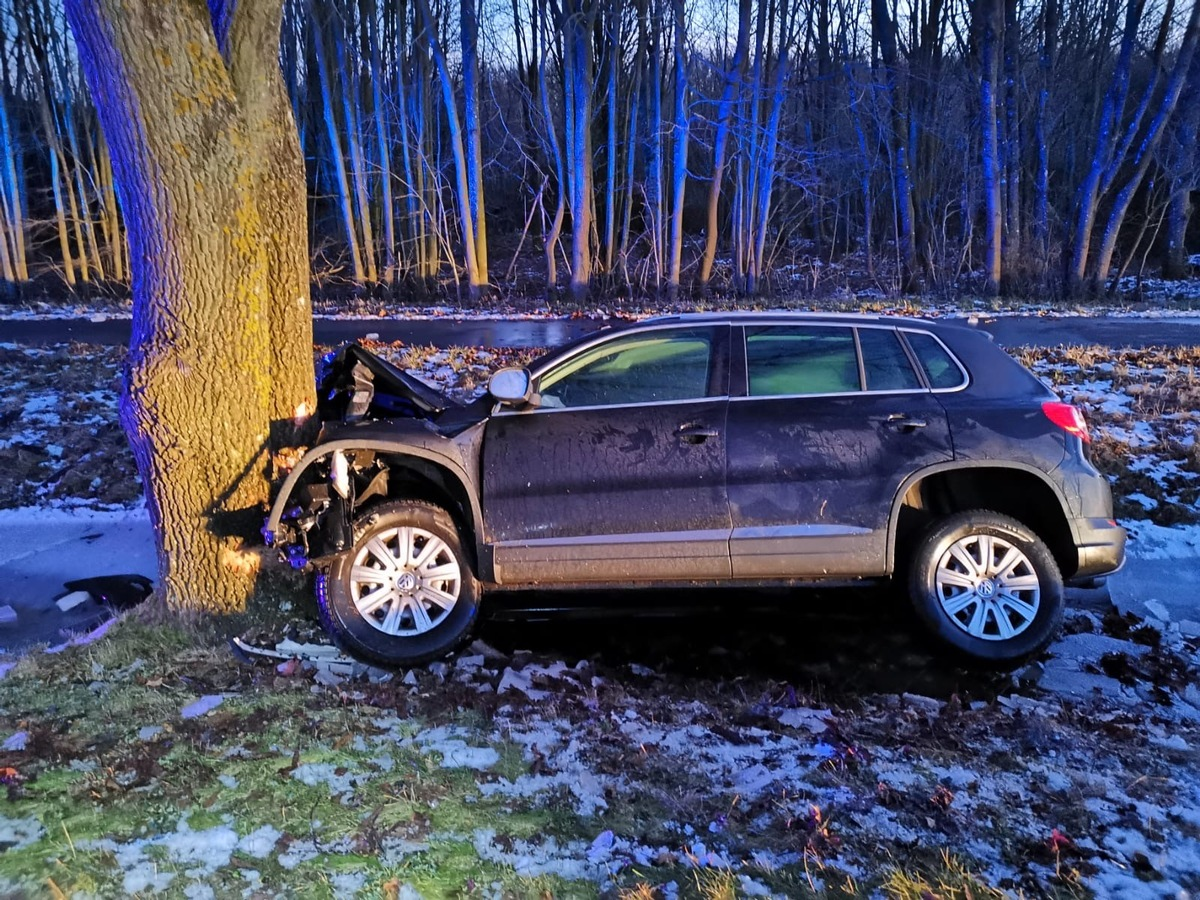 12.01.2024 - 13:43:05 | presseportal.deNach dem Durchfahren einer Linkskurve kam er nach rechts von der Fahrbahn ab und prallte gegen einen Baum. Hierbei verletzte sich der aus der Region stammende Mann leicht und wurde mittels Rettungsdienstes ins Krankenhaus gebracht. Am Pkw entstand wirtschaftlicher Totalschaden - der Gesamtschaden wird auf 15.000 Euro geschätzt.