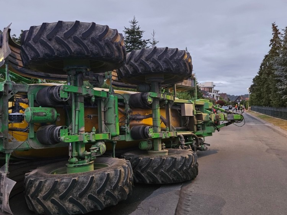 Vorliegenden Erkenntnissen zufolge befuhr ein landwirtschaftliches Gespann, bestehend aus einem Ackerschlepper und einem Spezialanhänger für Pflanzenschutzmittel, die Straße aus Richtung Ortsmitte kommend.