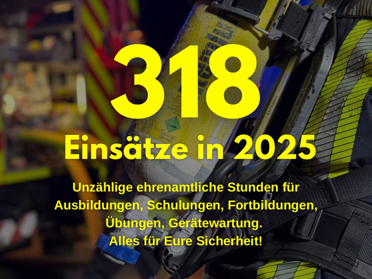Das alte Jahr 2025 schlieĂen wir mit 318 EinsĂ€tzen ab. Die Einsatzzahlen bleiben weiterhin vergleichsweise hoch. Noch im Vorjahr waren es 344 EinsĂ€tze.