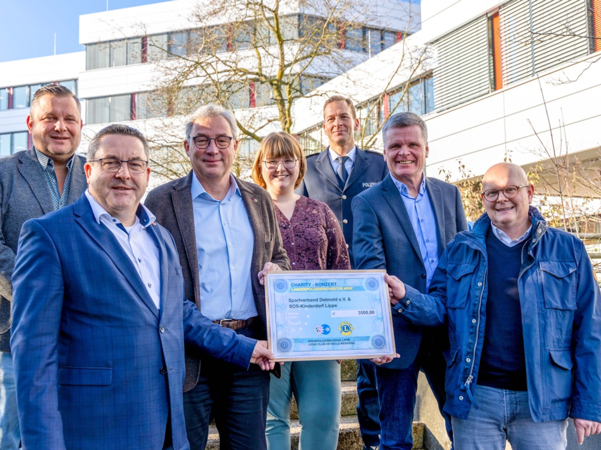 Am Donnerstag (07.12.2023) trafen sich Behördenleiter Dr. Axel Lehmann, Polizeioberrat Peter Pauls als Abteilungsleiter Polizei in Vertretung sowie Michael Vösgen, Präsident vom Lions Club Detmold-Residenz, im Kreishaus mit den beiden Spendenempfängern. In einem kleinen feierlichen Rahmen wurden insgesamt 3500 Euro an das SOS-Kinderdorf Lippe sowie den Sportverband Detmold e. V. überreicht: "Kinder sind unsere Zukunft und unser wichtigstes Gut. Und genau deshalb spenden wir das Geld für den lippischen Nachwuchs", so Dr. Axel Lehmann.
