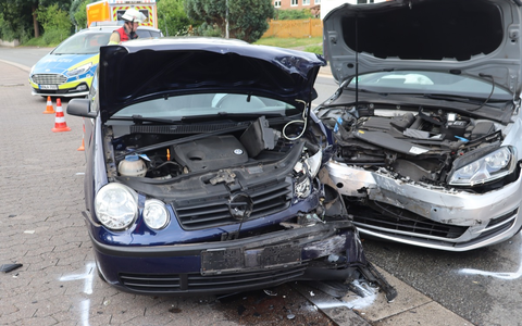 Löhne - (sls) Am Freitagmorgen (12.7.) gegen 07.15 Uhr wurden Polizeibeamte zu einem Verkehrsunfall auf der Weihestraße in Löhne gerufen. Bei Eintreffen der Beamten befanden sich die ein stark beschädigter VW Golf und VW Polo auf der Fahrbahn und waren nicht mehr fahrbereit. Nach Angaben der Unfallbeteiligten beabsichtigte ein 78-Jähriger aus Löhne mit seinem silbernen VW Golf von der Weihestraße nach links auf den Parkplatz eines Einkaufsmarktes einzufahren. Hierbei übersah er den entgegen kommenden Fahrer eines VW Polo. Der 49-Jährige aus Löhne war unterwegs in Richtung Oeynhausener Straße. Durch den Zusammenstoß wurden beide Fahrer im Brustbereich leicht verletzt. Beide wurden zur ambulanten Behandlung ins Krankenhaus nach Bad Oeynhausen gebracht. Die stark beschädigten Fahrzeuge (16.000EUR) mussten von der Unfallstelle abgeschleppt werden. Auslaufende Betriebsmittel wurden von der Feuerwehr Löhne beseitigt.