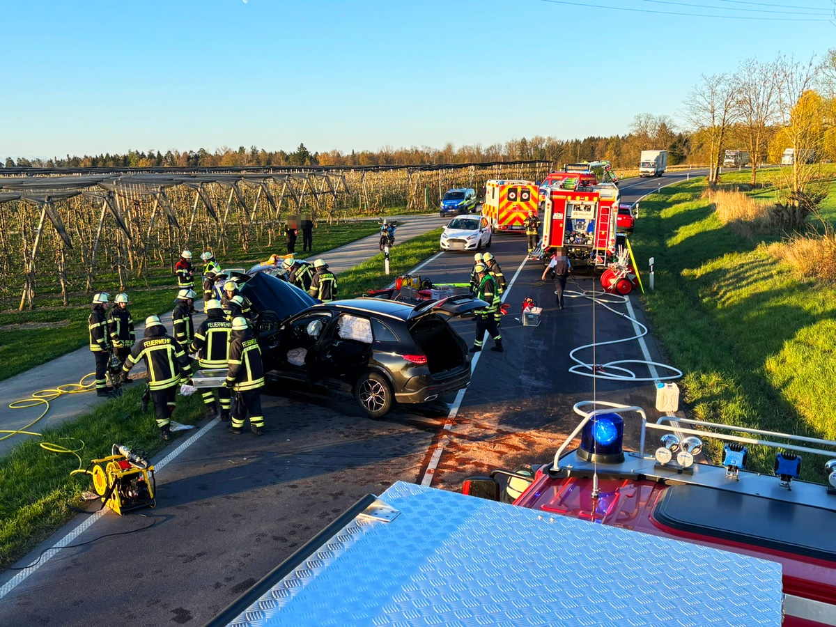 Am Mittwochmorgen (8. April 2026) kam es auf der Bundestraße 33 zwischen Markdorf und Wirrensegel kurz vor 7 Uhr zu einem schweren Verkehrsunfall, bei dem nach einer Frontalkollision zweier PKW beide Fahrer verletzt worden sind. Die Freiwillige Feuerwehr Markdorf rückte zur Unfallrettung aus und befreite den eingeklemmten Fahrer eines Renault Megane mit hydraulischem Rettungsgerät aus seinem Fahrzeug. Beide Fahrzeuglenker, die sich allein in den Fahrzeugen befunden hatten, wurden vom Rettungsdienst versorgt und in umliegende Krankenhäuser transportiert. Der Notarzt war mit dem Rettungshubschrauber Christoph 45 zur Einsatzstelle geflogen worden. Während der Einsatzmaßnahmen und der anschließenden Unfallaufnahme durch die Polizei war die Bundestraße in diesem Bereich für 2,5 Stunden voll gesperrt. Die Aufgaben der Feuerwehr, neben der Unfallrettung, waren das Absichern der Unfallstelle, das Sicherstellen des Brandschutzes, die Unterstützung des Rettungsdienstes und später das Säubern der Straße von Betriebsstoffen. Zur Schwere der Verletzungen, zum genauen Unfallhergang und zur Schadenshöhe hat die Feuerwehr keine Kenntnisse und verweist hier auf die Pressestelle des Polizeipräsidiums. Der stellvertretende Kreisbrandmeister Felix Engesser machte sich ein Bild der Rettungsmaßnahmen vor Ort. Die Feuerwehr war zweitweise mit 6 Fahrzeugen und 25 Feuerwehrleuten im Einsatz.