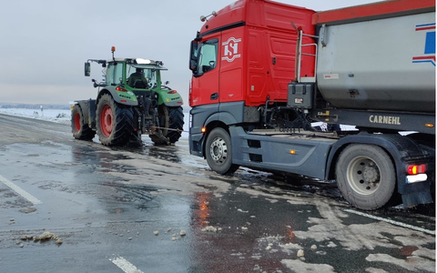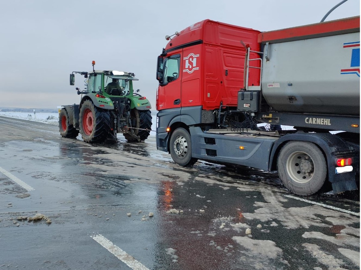 Aber am Ende haben alle die Rechnung ohne einen dort ansässigen Landwirt gemacht. Der fackelte nicht lange und bot mehreren LKW-Fahrern Hilfe an. Kurzerhand wurde das Abschleppseil befestigt und Abhilfe geschaffen.