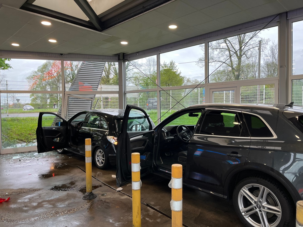 Aus bislang unbekannten Gründen fuhr der graue Audi eines 65-jährigen Moesers los. Er prallte gegen den schwarzen Mercedes und schob den Wagen einer 57-jährigen Frau aus Moers gegen die Glasfront der Waschhalle.