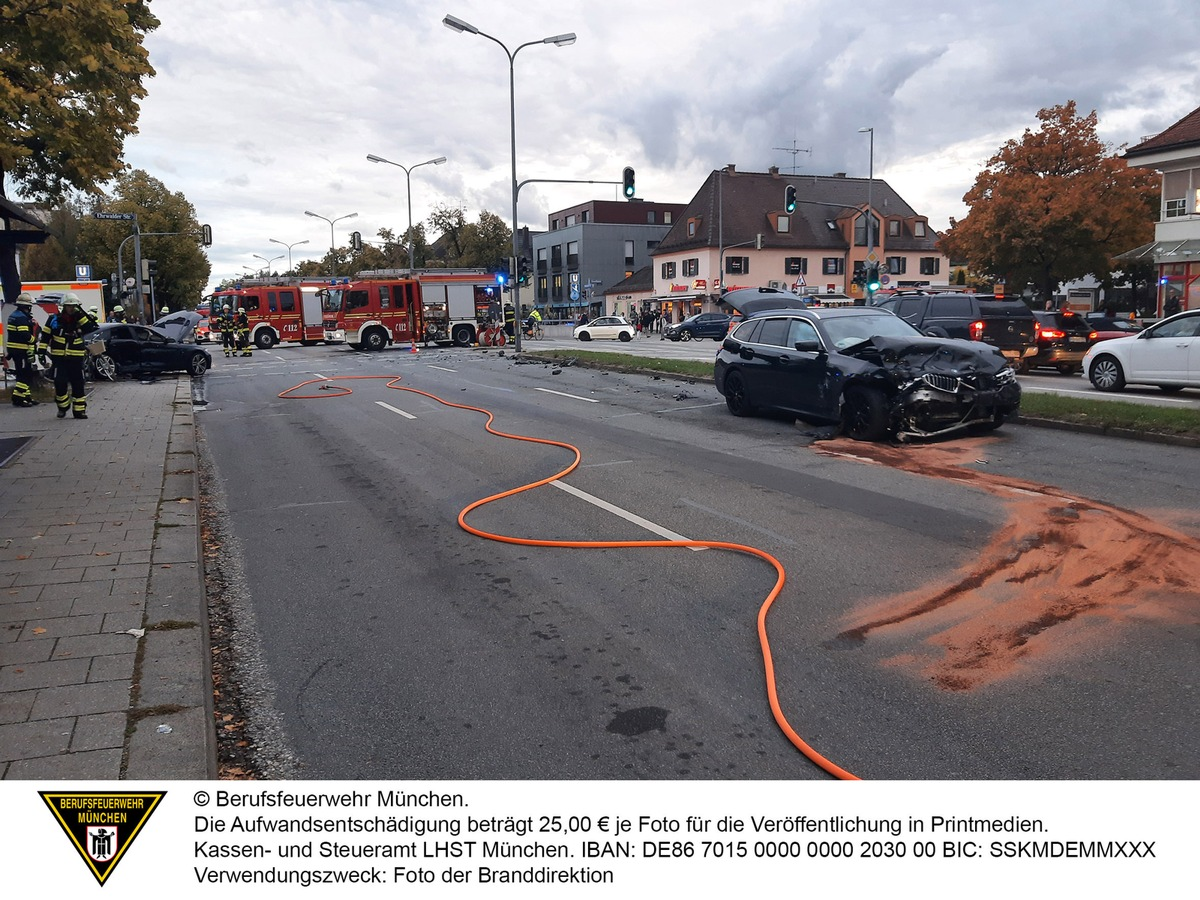 Mehrere Anrufer meldeten einen schweren Verkehrsunfall im Kreuzungsbereich der Fürstenrieder Straße und Ehrwalder Straße. Nach kurzer Zeit meldete ein weiterer Anrufer ein brennendes Auto. Beim Eintreffen der ersten Einsatzkräfte waren glücklicherweise bereits alle Insassen aus den Fahrzeugen gestiegen. Sie hatten sich in eine nahe gelegene Tierarztpraxis begeben und dort auf den Boden gelegt. Sofort begannen die Einsatzkräfte mit der Sichtung und Erstversorgung der Patienten. Zeitgleich löschten die Feuerwehrkräfte den brennenden BMW, der bei der Kollision an der Seite beschädigt wurde. Hierzu setzten die Einsatzkräfte zwei Löschrohre ein.