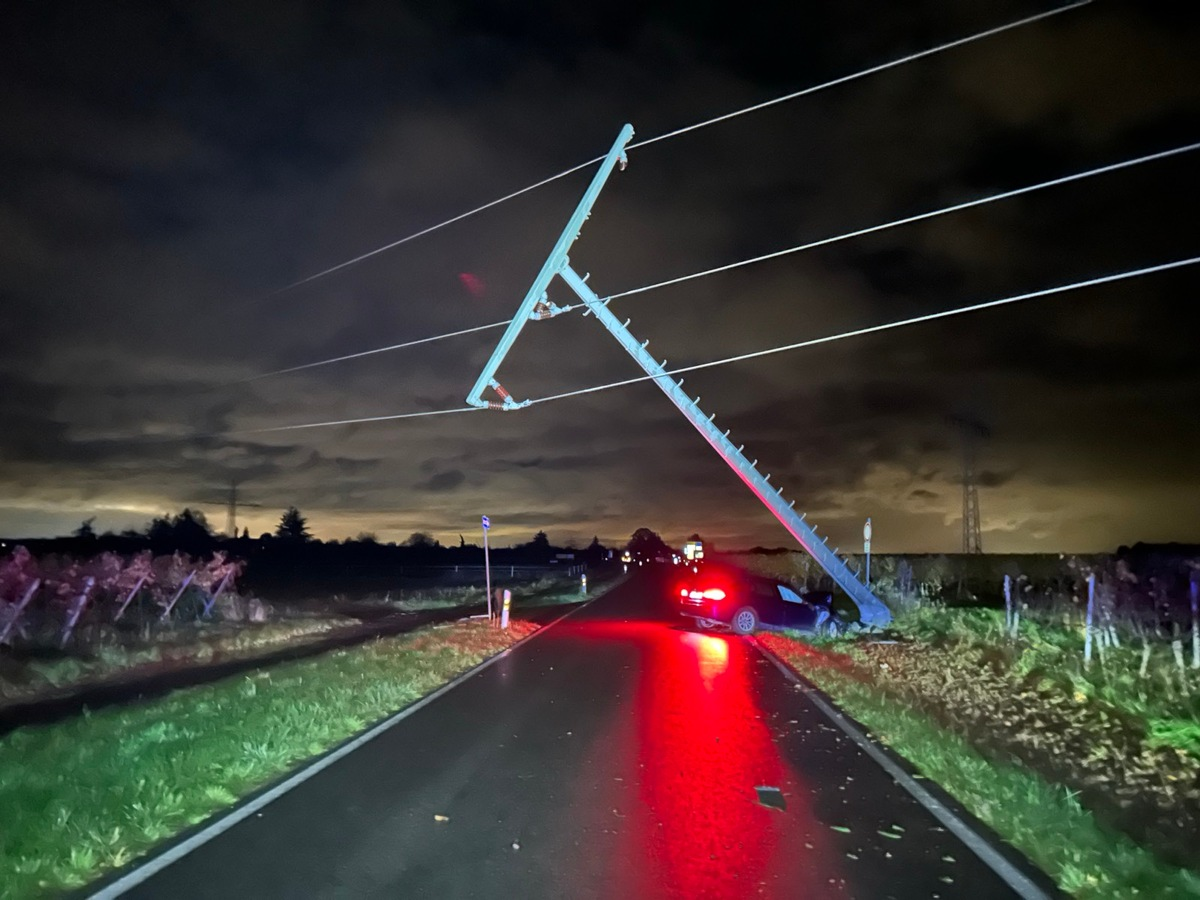 Neustadt/Weinstraße - Am frühen Sonntagmorgen, 26. Oktober 2025, gegen 02:05 Uhr, kam ein 25-jähriger Autofahrer aus der Stadt Neustadt mit seinem Pkw auf der Kreisstraße 9 - vom Mittelhambacher Kreuz kommend in Fahrtrichtung B39 - nach rechts von der Fahrbahn ab. Das Fahrzeug kollidierte dort mit einem freistehenden Freileitungsmast. Bei der Unfallaufnahme stellten die eingesetzten Polizeibeamten deutlichen Alkoholgeruch beim Fahrzeugführer fest. Ein Atemalkoholtest ergab einen Wert von über 1,3 Promille. Zur weiteren Abklärung wurde der Mann vorsorglich in ein umliegendes Krankenhaus verbracht, dort wurden leichte Verletzungen festgestellt. Sein Führerschein wurde mit dem Ziel der vorläufigen Entziehung sichergestellt, zudem wurde eine gerichtlich verwertbare Blutprobe angeordnet und entnommen. Am PKW entstand Totalschaden; das Fahrzeug war nicht mehr fahrbereit und musste abgeschleppt werden. Der beschädigte Freileitungsmast führte zu einer Unterbrechung der Stromversorgung im Bereich der Unfallstelle. Die Feuerwehr sowie der lokale Energieversorger waren im Einsatz. Die Stromversorgung wurde kurzfristig abgeschaltet. Ferner traten aus dem PKW Betriebsstoffe aus, wodurch es zu Flurschäden kam. Der geschätzte Sachschaden beläuft sich auf ca. 75.500 Euro. Gegen den 25-Jährigen wurde ein Strafverfahren wegen Gefährdung des Straßenverkehrs eingeleitet. Die K9 bleibt im Bereich der Unfallstelle bis auf Weiteres voll gesperrt. Eine Instandsetzung des beschädigten Freileitungsmastes durch den örtlichen Energieversorger wird zeitnah veranlasst.