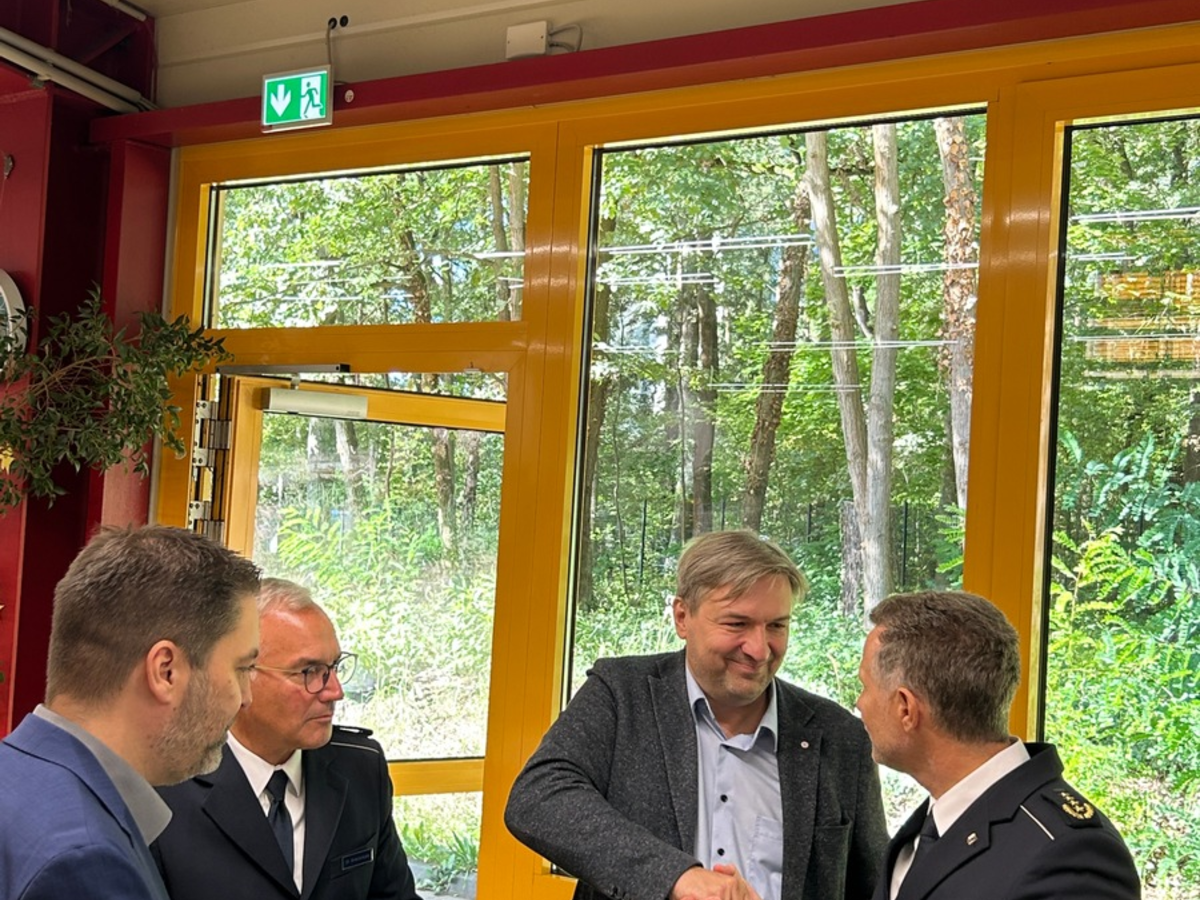 Auch der PrĂ€sident der Generalzolldirektion, Dr. Armin Rolfink, und der Leiter des Hauptzollamts Potsdam, Dr. Tim Bretschneider, nahmen aktiv am Schichtwechsel teil und lieĂen sich von Mathias Koch vom DRK-Kreisverband Potsdam/Zauch-Belzig eV und der Werkstattleitung, Detlef Schönrock, die verschiedenen Stationen der Werkstatt zeigen.