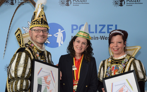Krefeld - Darin waren sich alle einig: Fröhlich, aber auch friedlich soll es zugehen beim StraĂenkarneval. Am Dienstag (10. Februar 2026) besuchte das Prinzenpaar Uli I. und Steffi III., zusammen mit Peter Bossers dem PrĂ€sidenten des CCC, das Krefelder PolizeiprĂ€sidium und wurden dort von der PolizeiprĂ€sidentin herzlich willkommen geheiĂen. "Die Krefelder wissen, wie man gemeinsam jeck und trotzdem friedlich feiert", freute sich Ursula Mecklenbrauck mit Blick auf die vorangegangenen Jahre, in denen es in Krefeld an Karneval zu keinen gröĂeren ZwischenfĂ€llen gekommen war. Davon, dass die Polizei trotzdem auf alle EventualitĂ€ten gut vorbereitet ist, machte das Prinzenpaar sich ein Bild im GesprĂ€ch mit der PolizeiprĂ€sidentin und beim anschlieĂenden Besuch der Leitstelle und des FĂŒhrungs- und Lageraums, wo groĂe PolizeieinsĂ€tze wie zum Beispiel bei KarnevalsumzĂŒgen koordiniert werden. Das Prinzenpaar hob den engagierten Einsatz von Polizei und Stadt hervor und dankte allen SicherheitskrĂ€ften, die an den Karnevalstagen fĂŒr die Krefelderinnen und Krefelder unterwegs sind. Steffi III. und Uli I. wurden zu Ehrenkommissaren mit dem Ermittlungsschwerpunkt "Heiterkeit und Frohsinn" ernannt und ĂŒberreichten ihrerseits der PolizeiprĂ€sidentin den Prinzenorden.