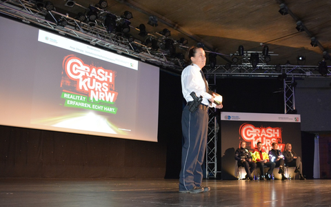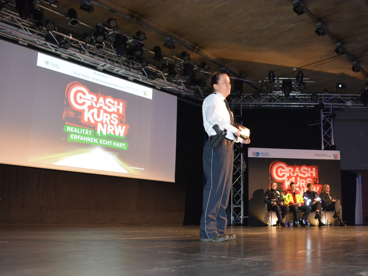 Im Unterricht werden die jungen Leute darauf vorbereitet, was sie in der Bühnenveranstaltung erwartet. Polizeibeamte, Feuerwehrleute, Rettungssanitäter, Notfallseelsorger, Angehörige und Opfer berichten darin von ihren Erfahrungen und Erlebnissen bei Unfällen, an denen junge Menschen beteiligt waren. Weitere Infos rund um "Crash Kurs NRW" gibt es im Internet unter https://polizei.nrw/artikel/realitaet-erfahren-echt-hart.