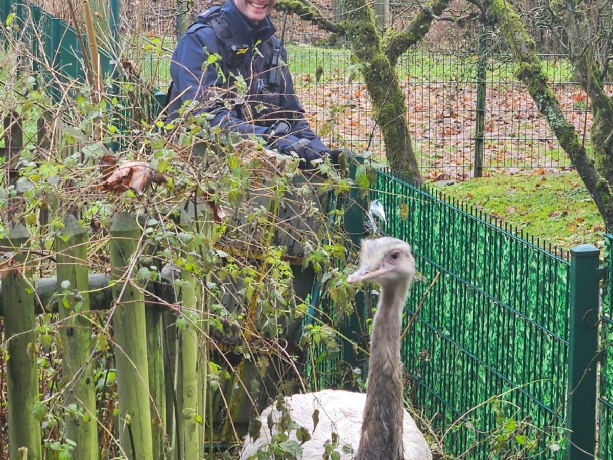 Schalksmühle - Heute Morgen gegen 10 Uhr meldeten Zeugen der Polizei einen freilaufenden "Vogelstrauß". Herkunft und Gattung waren schnell klar: Es handelte sich um einen flugunfähigen Nandu aus einem Gehege in Dahlerbrück. Als die Polizei bei den Besitzern klingelte, hatten die noch gar nichts bemerkt. Vor den Augen der Beamten schlüpfte Tier Nr. 2 durch den kaputten Zaun und sprang in die Volme. 100 Meter flussabwärts kletterte es an Land. Gemeinsam mit den Haltern und Mitarbeitern des Ordnungsamtes kreisten die Polizeibeamten den gefederten Flüchtling ein und leiteten ihn zurück ins Gehege. Die Suche nach dem ersten Ausreißer gestaltete sich langwieriger. Er stakste über die ohnehin gesperrte Schienenstrecke. Einen kurzen Augenblick mussten die Polizei den Autoverkehr auf der B 54 stoppen. Einfach so die Verkehrswege kreuzen, wie einem der Schnabel gewachsen ist: keine gute Idee! Eine Begegnung mit Fahrzeugen wäre nicht nur für den Nandu unangenehm. Um 12 Uhr schnappte sich die Halterin auch den ersten entlaufenen Vogel.