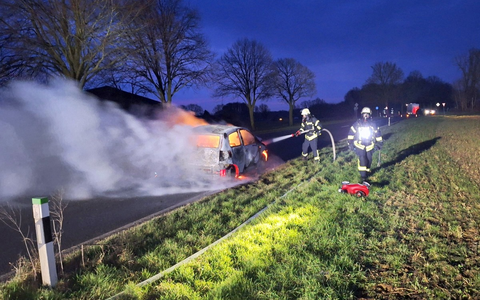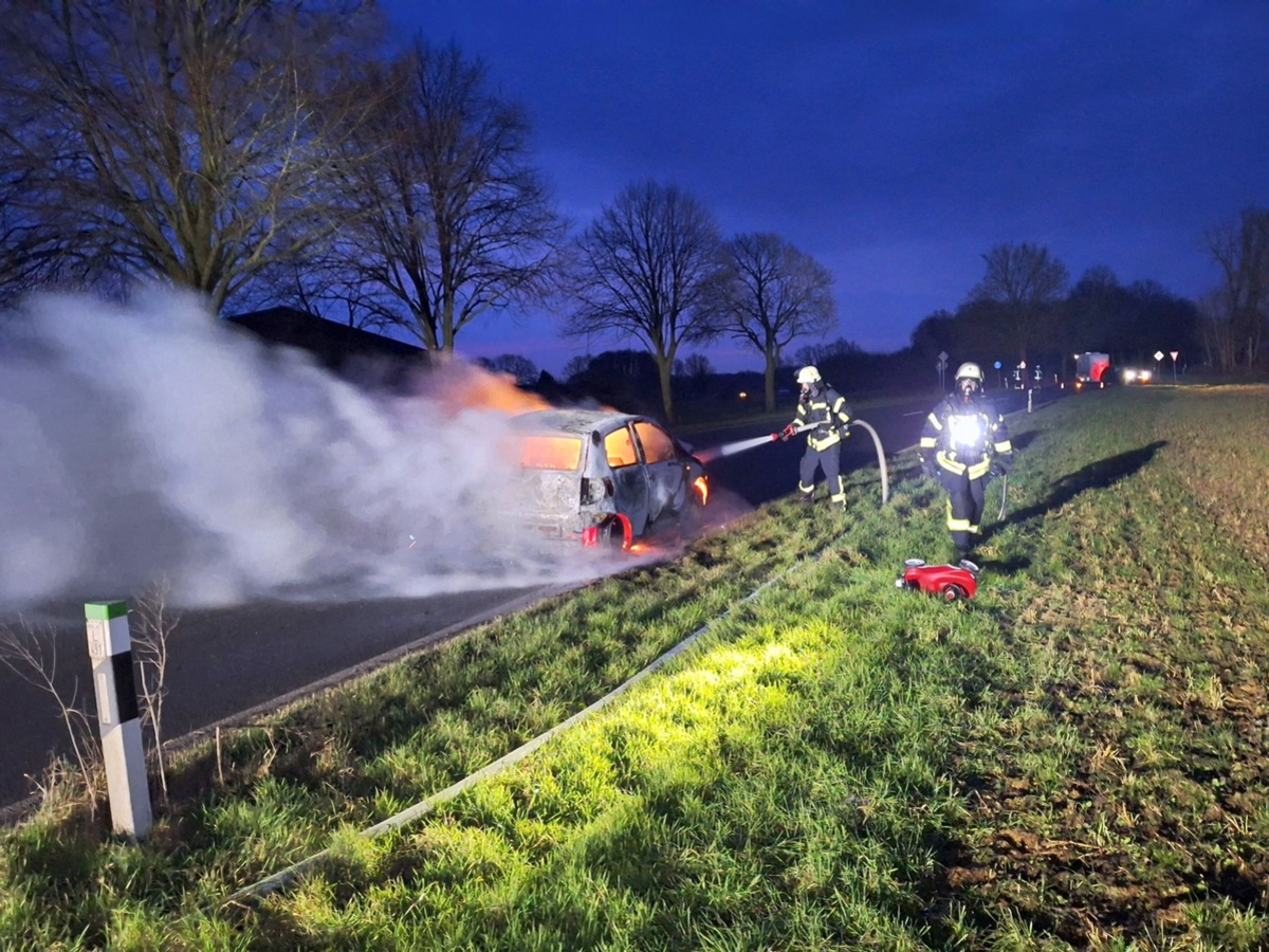 Um 06:51 Uhr wurde zunächst die Einheit Sonsbeck mit dem Stichwort "B2 PKW-Brand" zum Bereich Stettiner Straße/Alpener Straße gerufen. Die Einsatzstelle wurde schließlich einige hundert Meter hinter dem Ortausgang auf der Alpener Straße vorgefunden. Dort war ein PKW aus unbekannter Ursache in Brand geraten.