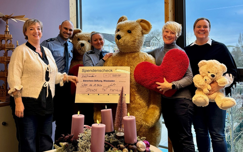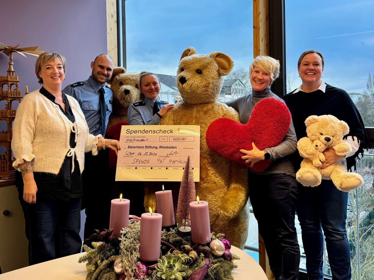 18.12.2024 - 15:41:39 | presseportal.deStellvertretend für alle Kolleginnen und Kollegen der Polizeistation Hofheim überreichte die Leiterin der Polizeidirektion Main Taunus Carina Lerch den symbolischen Scheck an das Kinderhospiz der Bärenherz Stiftung Wiesbaden. Rechtzeitig vor Weihnachten konnten auch selbstgebackene Plätzchen sowie Spielsachen an Petra Tölle (Stiftung Bärenherz) überreicht werden. In einem sehr herzlichen und "bärigen" Rahmen gab sie einen Einblick in die unglaubliche Arbeit, welche das Hospiz bei der Betreuung sterbenskranker Kinder und deren Familien täglich leistet. Die von der Polizeibeamtin Simone Sieger initiierte Spendenaktion beruhte auf dem Sammeln von Pfandflaschen und erbrachte 400 Euro am Pfandautomaten.