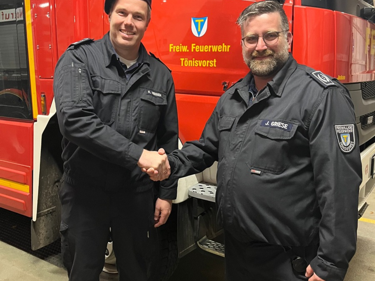 Jens Griese wünschte Kai Hebben, der weiterhin als Löschzugführer im Tönisvorster Stadtteil Vorst tätig sein wird, viel Erfolg und immer ein glückliches Händchen bei den zu treffenden Entscheidungen.
