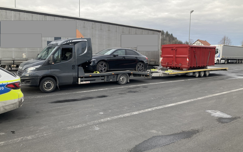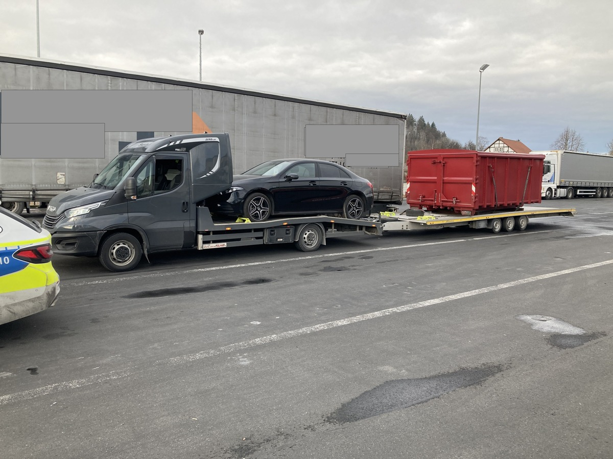 Eine Streife der spezialisierten Verkehrsüberwachung der Polizeiautobahnstation Bad Hersfeld wurde am Dienstag (14.01.) auf der A7, im Bereich des Kirchheimer Dreieckes, auf den polnischen Lastzug aufmerksam. Das Zugfahrzeug, ein Lkw der Marke IVECO mit einer zulässigen Gesamtmasse von 3,5 Tonnen war mit einem Pkw beladen. Der Anhänger, ebenfalls mit einer zulässigen Gesamtmasse von 3,5 Tonnen, mit einem Container. Wie die Beamten vor Ort schnell feststellten, war die Ladungssicherung des über zwei Tonnen schweren Containers derart mangelhaft, dass sich dieser bereits durch die Fahrbewegungen auf der Ladefläche bewegt hatte. Sichtbare Kratzspuren der Bewegung waren sowohl am Anhänger, als auch an den zur Unterlage verwendeten Hölzern zu erkennen. Im Einzelnen wurden Zurrmittel in ungenügender Anzahl und Beschaffenheit zur Ladungssicherung verwandt. Unterlagen zur Erhöhung des Reibwertes waren nicht vorhanden. Ebenfalls bewerteten die Spezialisten die zur Unterlage verwendeten, kippgefährdeten und lediglich lose übereinander gelegten Kanthölzer als höchst kritisch.