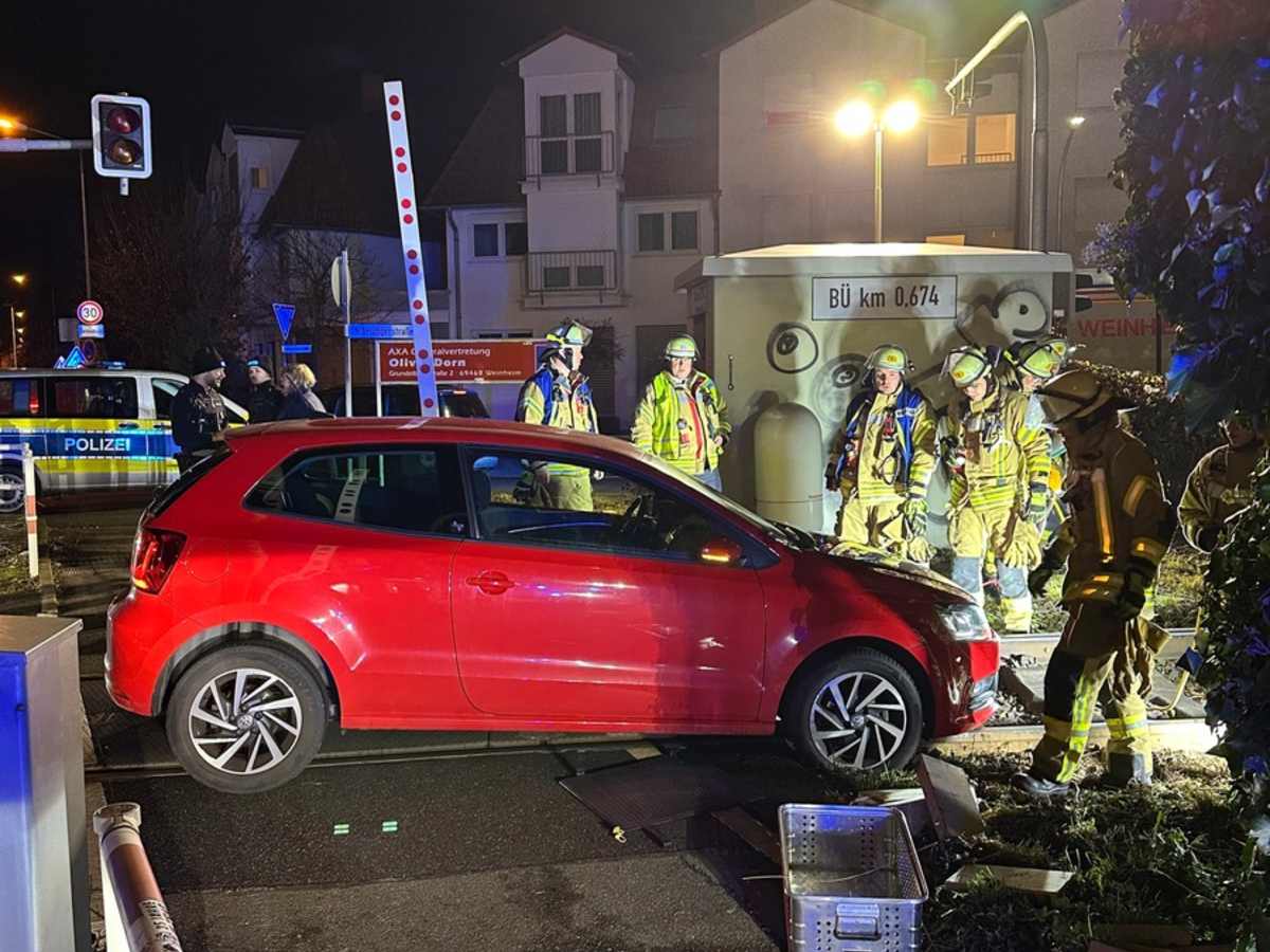 Weinheim - Am Freitagabend bot sich an der Bergstraße in Weinheim ein ungewöhnliches Bild und für einen Stunde den Bahnverkehr stilllegte. Eine Fahrerin eines Volkswagen wollte rechts in die Nibelungenstraße abbiegen. In der Dunkelheit und durch den Verlauf des Bahnübergangs orientierte sie sich jedoch falsch. Sie bog nicht über die reguläre Fahrspur auf die Nibelungenstraße ab, sondern direkt auf dem Bahnübergang. Nach wenigen Metern setzte der Wagen durch den deutlichen Höhenunterschied auf und kam mitten auf den Gleisen zum Stillstand. Das Fahrzeug setzte auf. Ein eigenes Zurückfahren war unmöglich. Die Fahrerin blieb ruhig und der Notruf wurde abgesetzt. Die Polizei Weinheim traf als erste ein, sicherte die Einsatzstelle und veranlasste die sofortige Sperrung der Bahnlinie, damit kein Zug in die Unfallstelle hineinfahren konnte. Schon kurz darauf forderten die Polizeibeamten die Feuerwehr nach, da ohne technische Unterstützung keine sichere Bergung möglich war. Die Einsatzkräfte der Feuerwehr leuchteten die Unfallstele großflächig aus. Mit Hebekissen und Unterbaumaterial schufen sie Stück für Stück neuen Halt unter dem VW. Zentimeterweise hob die Löschgruppe das festgefahrene Fahrzeug an, stabilisierte es mit Unterbaumaterial und stellte so wieder genügend Bodenfreiheit her, um den Wagen schonend aus dem Gleisbereich zu bewegen. Präzise wurde die Hebekissen eingesetzt, um das das Fahrzeug sicher anzuheben. Rund eine Stunde war die Bahnstrecke gesperrt. Nachdem der Volkswagen von den Schienen entfernt worden war, gab die Polizei Weinheim über die Deutsche Bahn die Strecke wieder frei. Am Fahrzeug entstand geringer Sachschaden. Die Fahrerin blieb unverletzt. Die Insassen der Bahn mussten im Zug warten, bis die Strecke wieder freigegeben war und konnten im Anschluss ihre Fahrt zum Weinheimer Bahnhof fortsetzen.