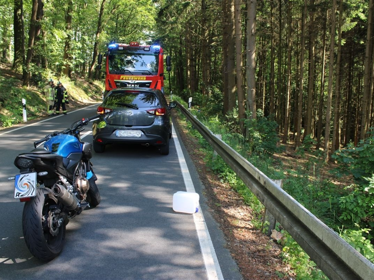 Ein 60-jähriger Wermelskirchener fuhr mit seinem Pkw der Marke Mazda auf der L 409 in Richtung Hauptstraße. Ausgangs einer Kurve erkannte er plötzlich einen Kanister, der auf seiner Fahrspur lag, bremste seinen Pkw ab und wollte nach links ausweichen.