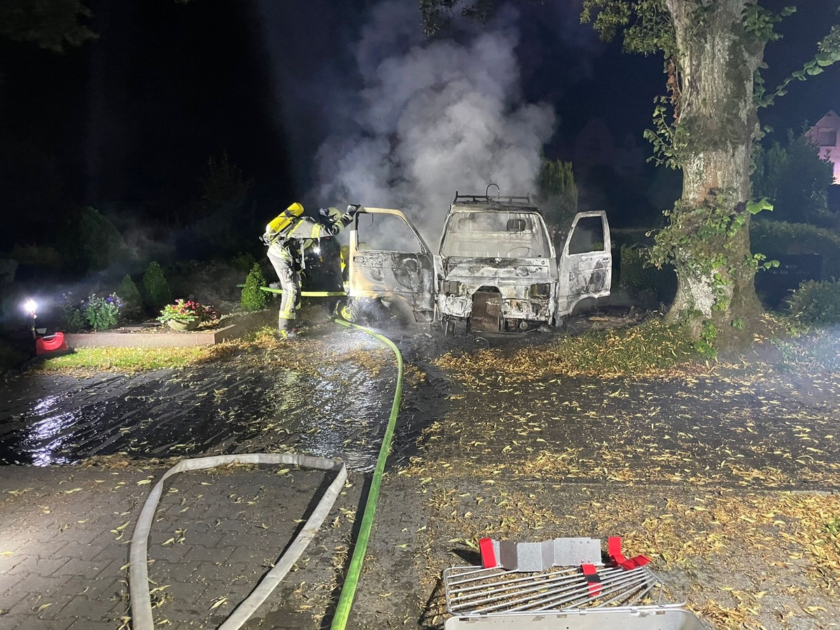 In der Nacht zum Samstag wurden die Löscheinheiten Grundschöttel und Volmarstein um 02:36 Uhr zu einem Brandereignis auf dem Friedhof in Volmarstein alarmiert. Bei der ersten Erkundung vor Ort stellte sich heraus, dass ein Fahrzeug auf dem GelĂ€nde in Vollbrand stand. Umgehend ging ein Trupp unter Atemschutz mit einem Strahlrohr zur BrandbekĂ€mpfung vor. Parallel wurde eine Wasserversorgung von der von-der-Recke-StraĂe aufgebaut. Die direkt eingeleiteten LöschmaĂnahmen zeigten schnell Wirkung und eine Ausbreitung auf einen nahestehenden Baum konnte verhindert werden. Nach Abschluss der Löscharbeiten wurde die Einsatzstelle noch mit einer WĂ€rmebildkamera kontrolliert und an die anwesende Polizei ĂŒbergeben. Angaben zur Brandursache und Schadenhöhe können durch die Feuerwehr nicht gemacht werden. Die eingesetzten KrĂ€fte kehrten nach circa 1 Stunde und 30 Minuten an die Standorte zurĂŒck.