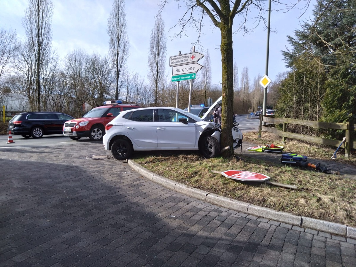 Die Löscheinheit Grundschöttel wurde am Samstag, den 10.02.2024, um 11:44 Uhr zu einem Verkehrsunfall auf der Vogelsanger Straße, Ecke Köhlerstraße alarmiert. Hier war ein Pkw aus ungeklärter Ursache von der Fahrbahn abgekommen und gegen einen Baum sowie mehrere Verkehrsschilder gefahren. Die Fahrbahn wurde durch die Einsatzkräfte komplett gesperrt, der Brandschutz an der Unfallstelle sichergestellt sowie die Fahrzeugbatterie abgeklemmt. Dafür musste die Motorhaube mittels schwerem Gerät geöffnet werden. Ein nunmehr in die Fahrbahn ragendes Stoppschild wurde mittels Trennschleifer entfernt. Der Fahrer des Fahrzeugs wurde durch die Feuerwehr betreut, eine rettungsdienstliche Behandlung lehnte dieser allerdings ab. Nach der Übergabe der Einsatzstelle an die Polizei und den Stadtbetrieb konnte dieser nach 40 Minuten beendet werden.
