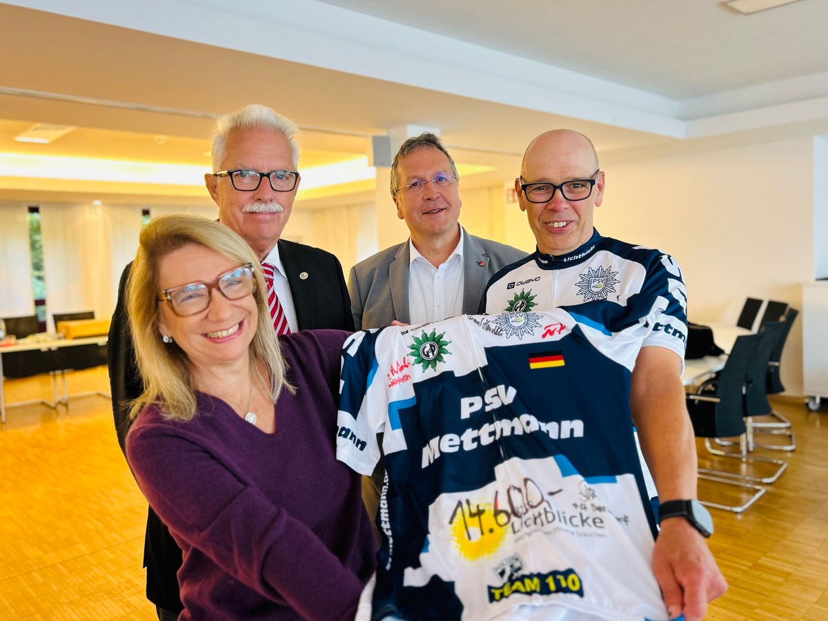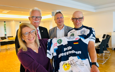 Gemeinsam mit den beiden Schirmherren der Benefiz-Radtour, dem Leiter der Kreispolizeibehörde Mettmann, Landrat Thomas Hendele, sowie Wülfraths Bürgermeister Reinhard Ritsche überreichte Frank Eigelshofen nun die Spende symbolisch an Tatjana Pioschyk, Chefredakteurin von Radio Neandertal - und zwar in Form eines signierten Radtrikots.
