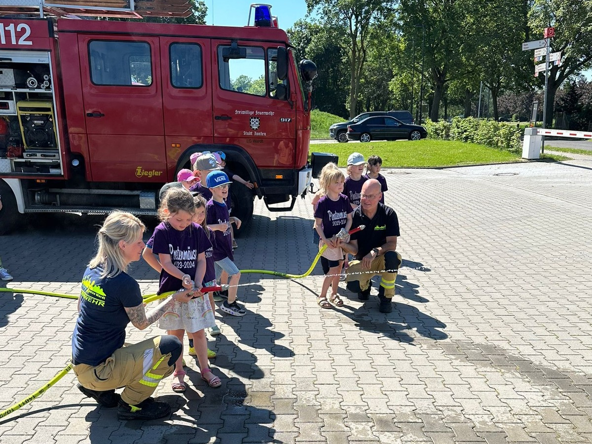 23.05.2024 - 18:29:20 | presseportal.deZunĂ€chst ging es darum das richtige Verhalten im Brandfall inklusive dem richtigen Notruf zu besprechen und praktisch zu ĂŒben. Im Anschluss wurden die Fahrzeuge und GerĂ€te der Feuerwehr ganz genau unter die Lupe genommen und von den Kameradinnen und Kameraden kindgerecht vorgestellt.