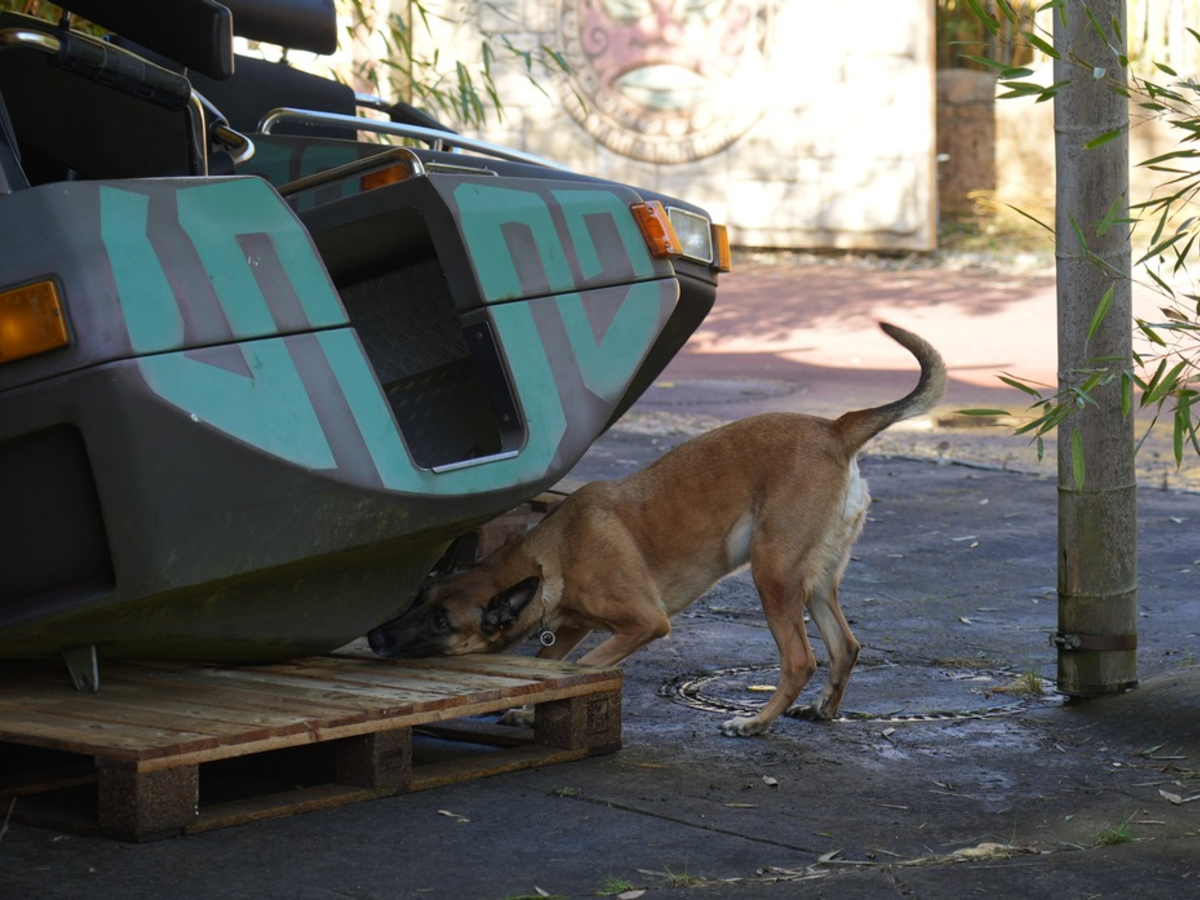 Am Vormittag durchliefen die Gespanne sechs Übungsstationen, die sich auf unterschiedliche Bereiche des Parks verteilten. Zwischen den vielfältigen Attraktionen erschnüffelten die Hunde verschiedenste Stoffe. Die Herausforderung war dabei, dass es sich um Stoffe handelte, mit denen die Hunde bislang nicht trainiert wurden. Ziel ist es, sie so an neue Gerüche heranzuführen und ihre Fähigkeiten für reale Einsatzlagen weiter auszubauen. Die abwechslungsreiche Kulisse eines Freizeitparks bietet hierfür ideale Bedingungen: viel Ablenkung durch verwinkelte Wege, unterschiedliche Raumstrukturen und vielfältige Geruchsquellen schaffen realitätsnahe Szenarien, wie sie auch in einer echten Einsatzsituation vorkommen können. Wo sonst Familien und Actionfans ihre Freizeit genießen, trainierten gestern hochkonzentrierte vierbeinige Spezialkräfte und ihre menschlichen Kolleginnen und Kollegen.