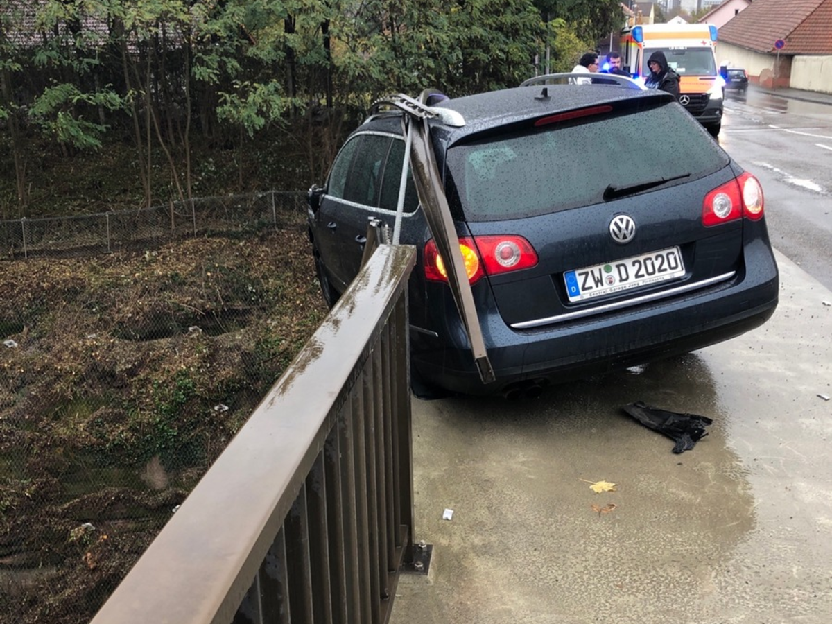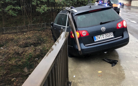 Zweibrücken - Am 04.11.2023 um ca. 12:30 Uhr befuhr ein 58-jähriger Mann mit seinem VW Passat die Steinhauser Straße in Richtung Seilerstraße. Ein 84-jähriger Mann befuhr mit seinem BMW die Ringstraße aus Richtung Fuchsstraße kommend, wollte im Kreuzungsbereich zur Steinhauser Straße geradeaus über diese weiterfahren und missachtete dabei die Vorfahrt des 58-Jährigen. Durch den Zusammenstoß kam dessen Fahrzeug nach links von der Fahrbahn ab, durchbrach teilweise ein dortiges Brückengeländer und kam dort halb in der Luft hängend zum Stillstand. Der Mann erlitt durch den Unfall leichte Verletzungen, konnte sein Fahrzeug aber selbständig über die Beifahrertür verlassen. Der Unfallverursacher blieb unverletzt. Es entstand ein Gesamtsachschaden von ca. 80.000 Euro. Der VW Passat wurde durch Kräfte der Feuerwehr zunächst mittels mehrerer Seilwinden gegen Absturz gesichert bis er letztendlich durch ein Abschleppunternehmen geborgen werden konnte. Die darunterliegende L 471 musste für die Zeit der Bergung für ca. 15 Minuten durch Polizei und Feuerwehr voll gesperrt werden. Die Feuerwehr übernahm des Weiteren noch die Absicherung des stark beschädigten Brückengeländers. |PIZW