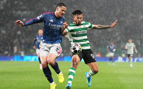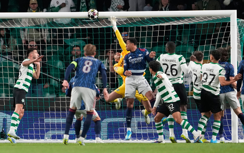 Im Regen von Lissabon wurden die auf Ballkontrolle fokussierten Gunners vom portugiesischen Double-Sieger zu Beginn mĂ€chtig unter Druck gesetzt. Das fĂŒhrte bereits in der 6. Minute zur ersten richtig dicken Möglichkeit durch Linksverteidiger Maxi AraĂșjo, der bei seinem wuchtigen Abschluss von der Strafraumkante die Latte traf. Arsenals Keeper David Raya war noch mit den Fingerspitzen dran.