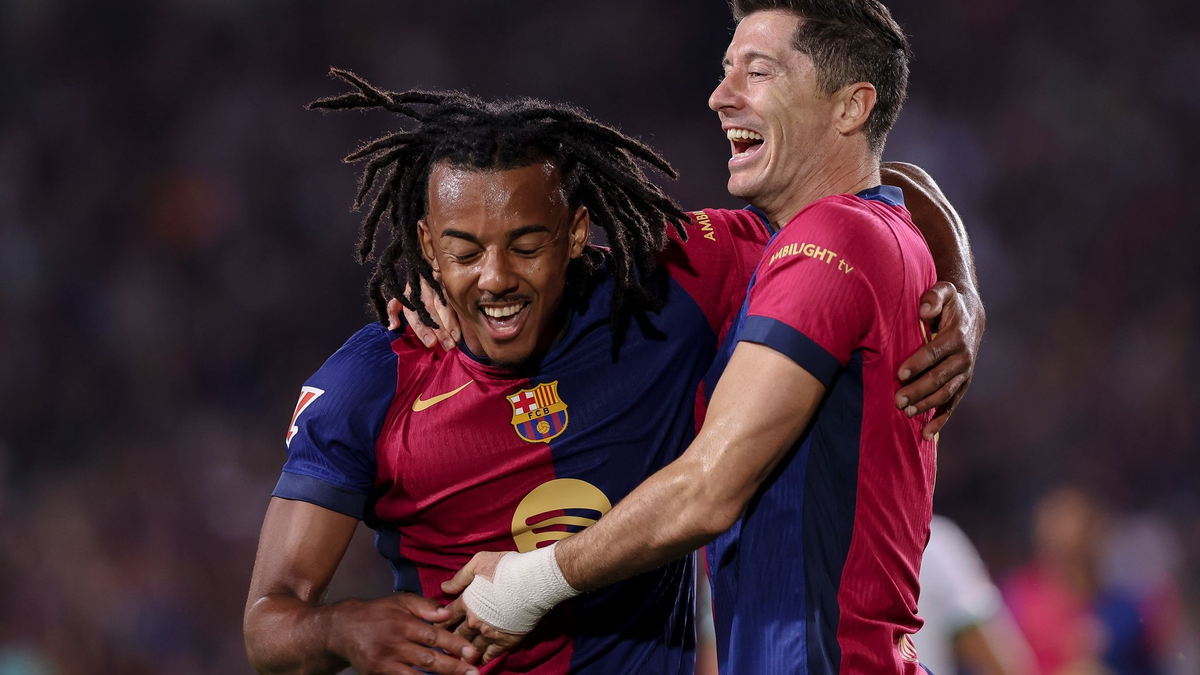 Jubel über das 6.500. Ligator in der Geschichte des FC Barcelona: Torschütze Robert Lewandowski (r) feiert mit Jules Kounde. - Foto: Gerard Franco/DAX via ZUMA Press Wire/dpa