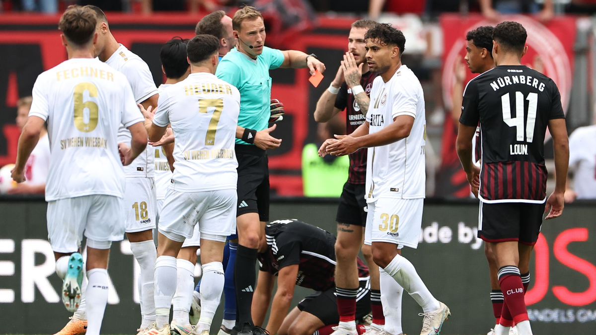 Nürnbergs Ahmet Gürleyen hatte früh die Rote Karte wegen einer Notbremse (11.) gesehen, doch auch die Gäste dezimierten sich noch vor der Pause selbst: Hyun-Ju Lee sah wegen wiederholten Foulspiels die Gelb-Rote Karte (40.). Nach einer weiteren Ampelkarte gegen den früheren Nürnberger Martin Angha (85.) beendete Wehen Wiesbaden das Spiel nur zu neunt.
