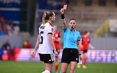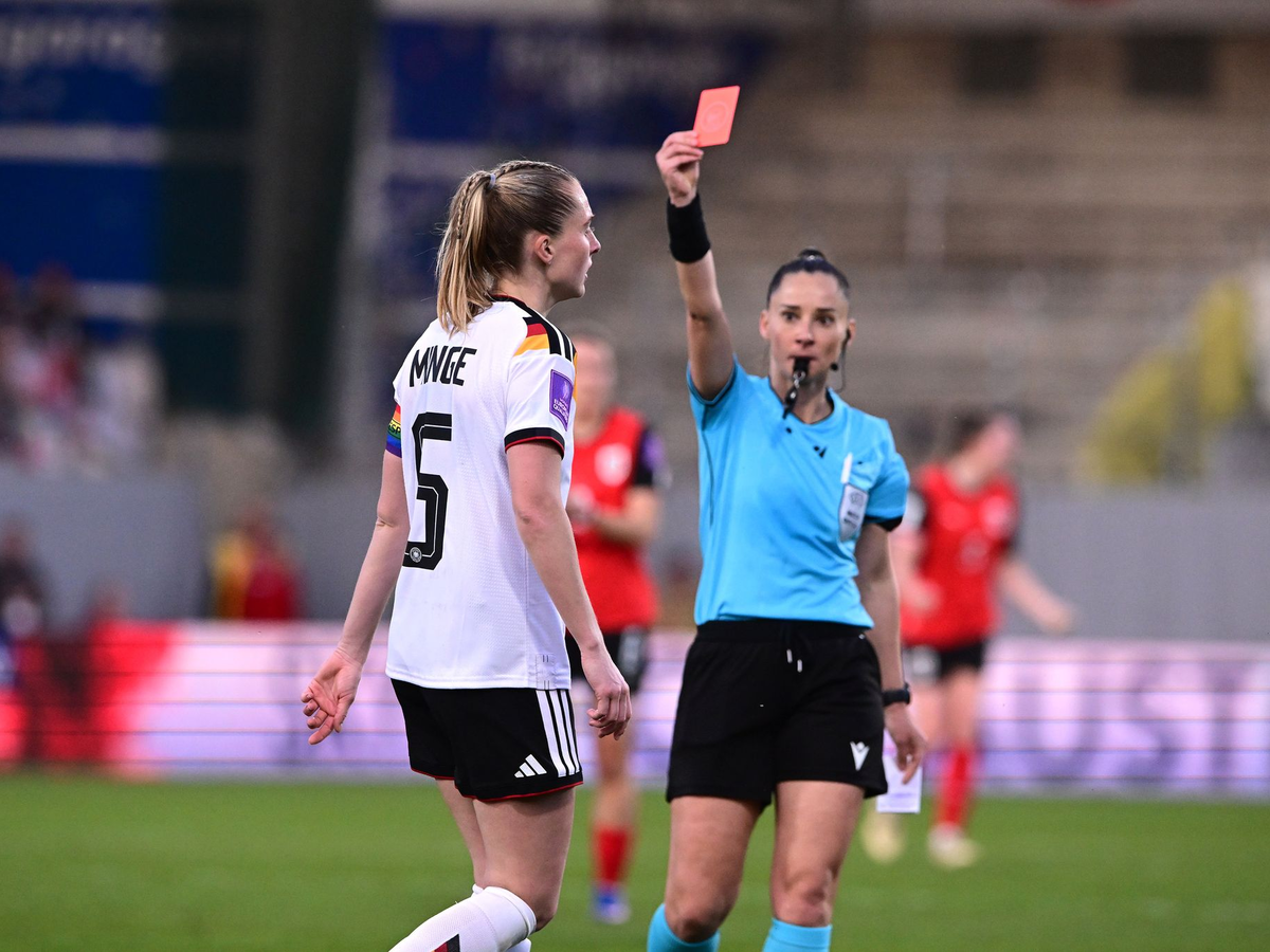 • Rote Karte für DFB-Kapitänin Janina Minge beim 0:0 in Österreich. - Foto: Expa/ Reinhard Eisenbauer/APA/dpa